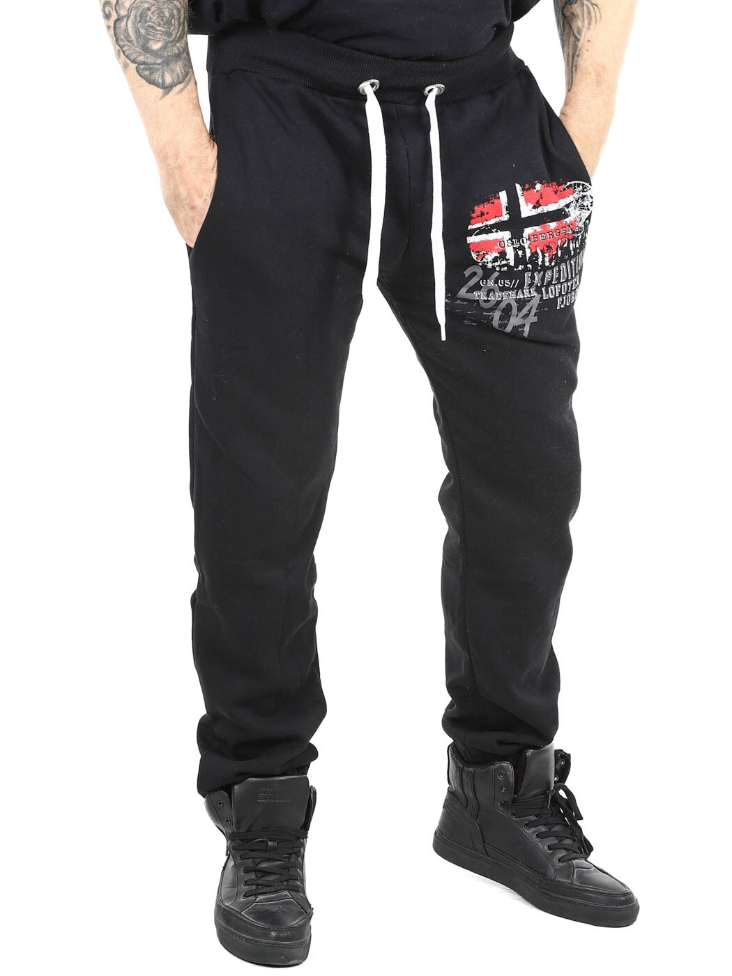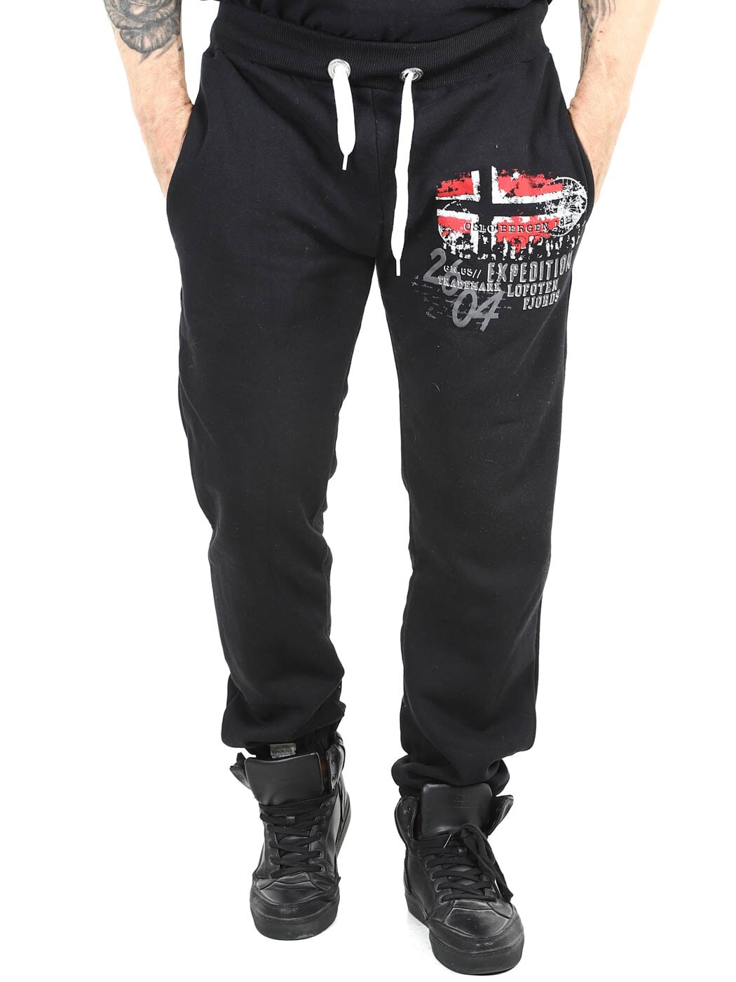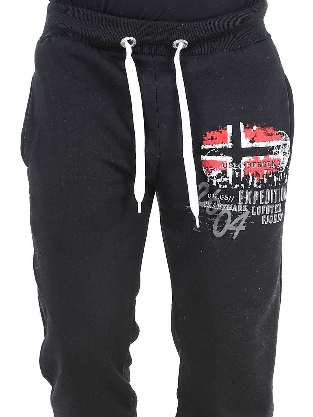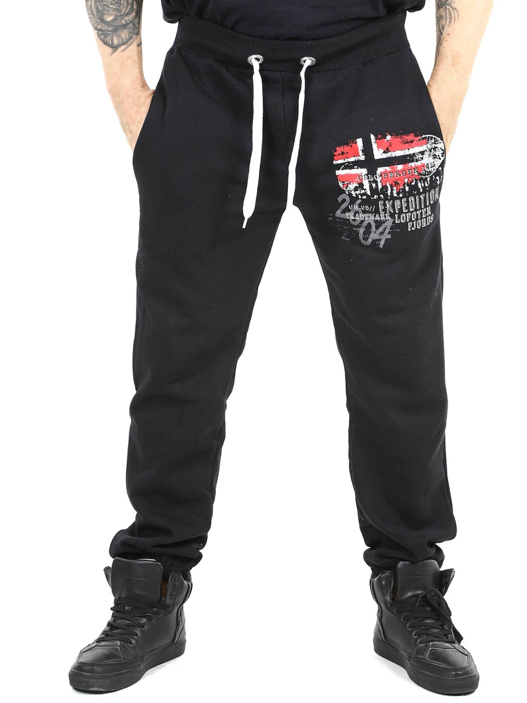 Wygodne spodnie dresowe z miękką wyściełaną stroną wewnętrzną. Posiadają nadruk flagi na nogawce oraz dwie otwarte kieszenie. Zaprojektowane z prążkowanym ściągaczem w talii, ze sznurkiem do regulacji oraz gumką przy nogawkach.