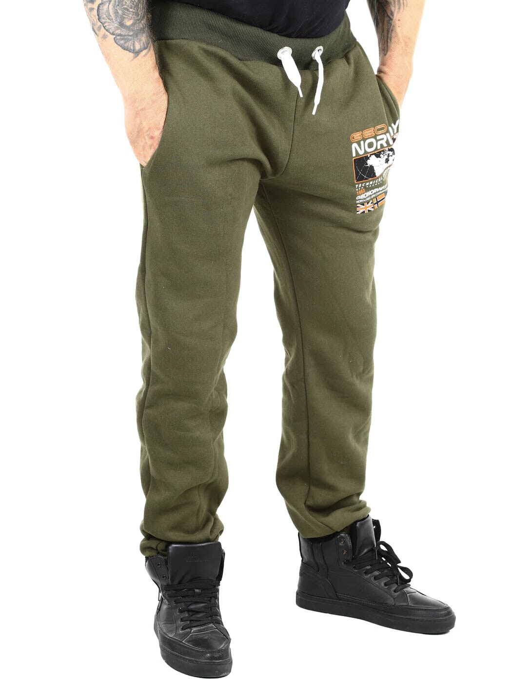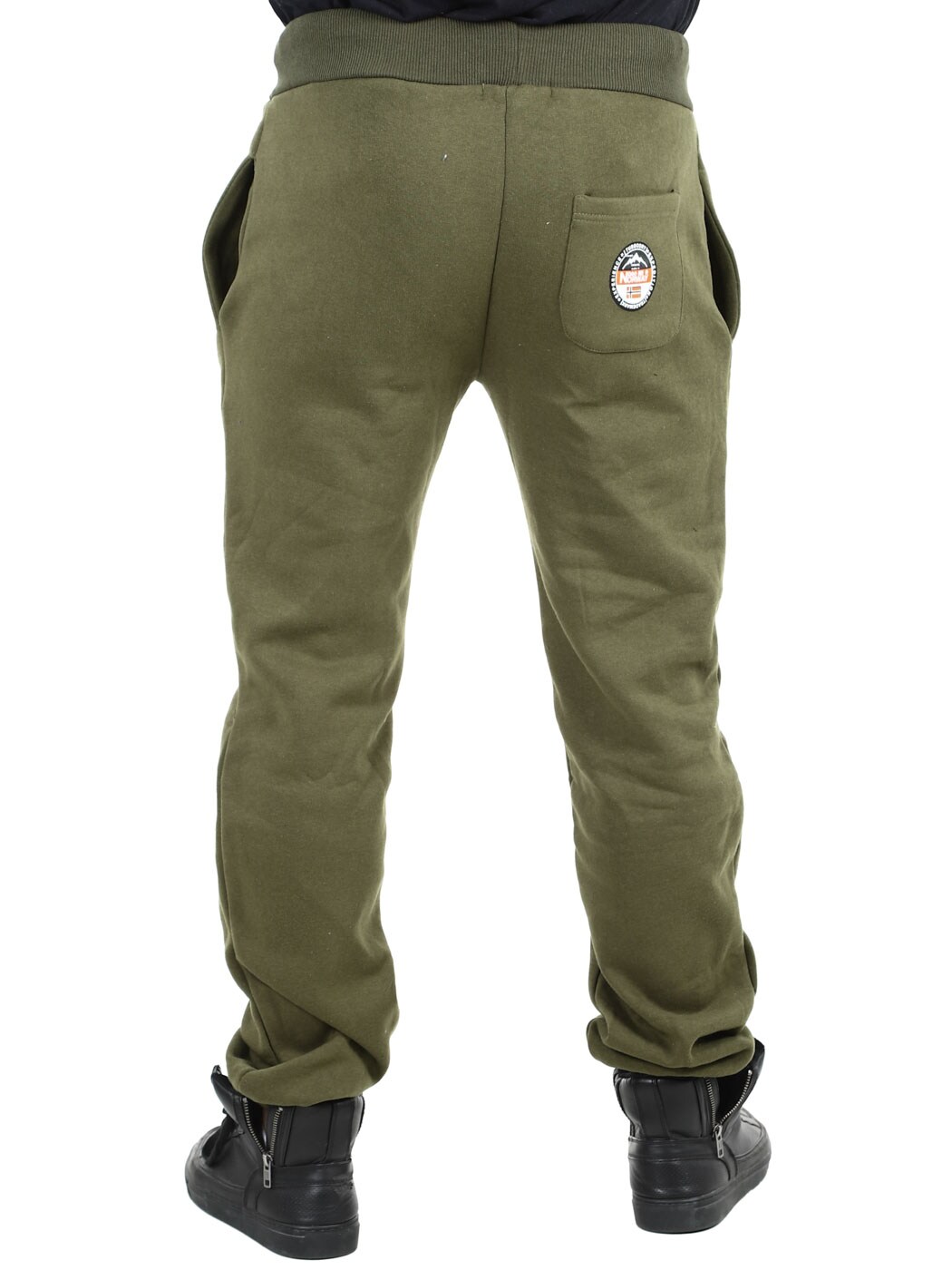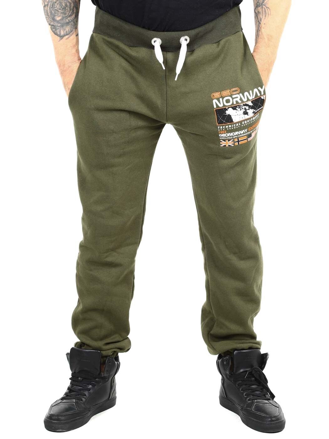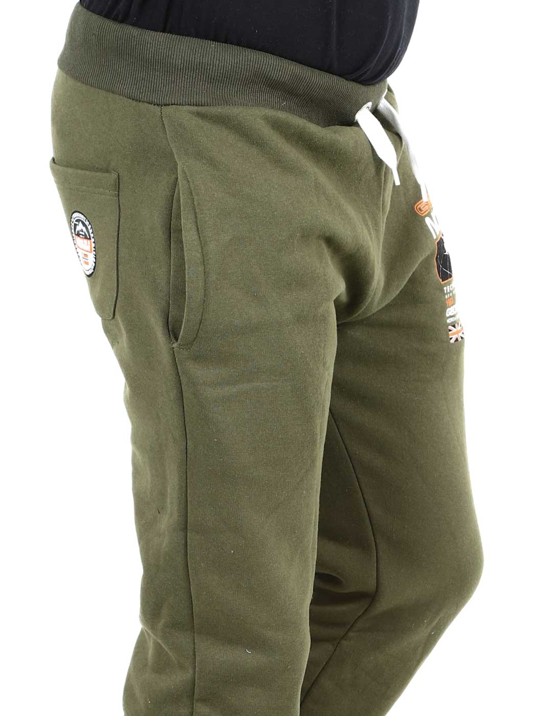 Zielone spodnie z kontrastowym nadrukiem na nogawkach i tylnej kieszeni. Posiadają trzy otwarte kieszenie, szczotkowaną podszewkę i sznurek w pasie. Ściągacze w pasie i elastyczne zakończenia nogawek.