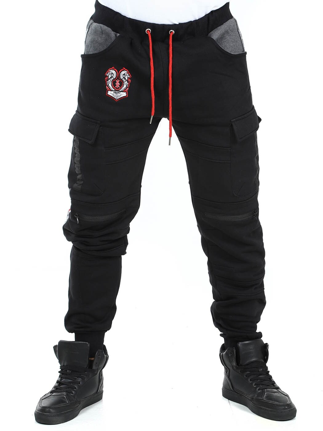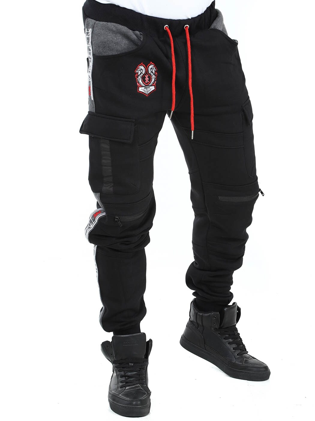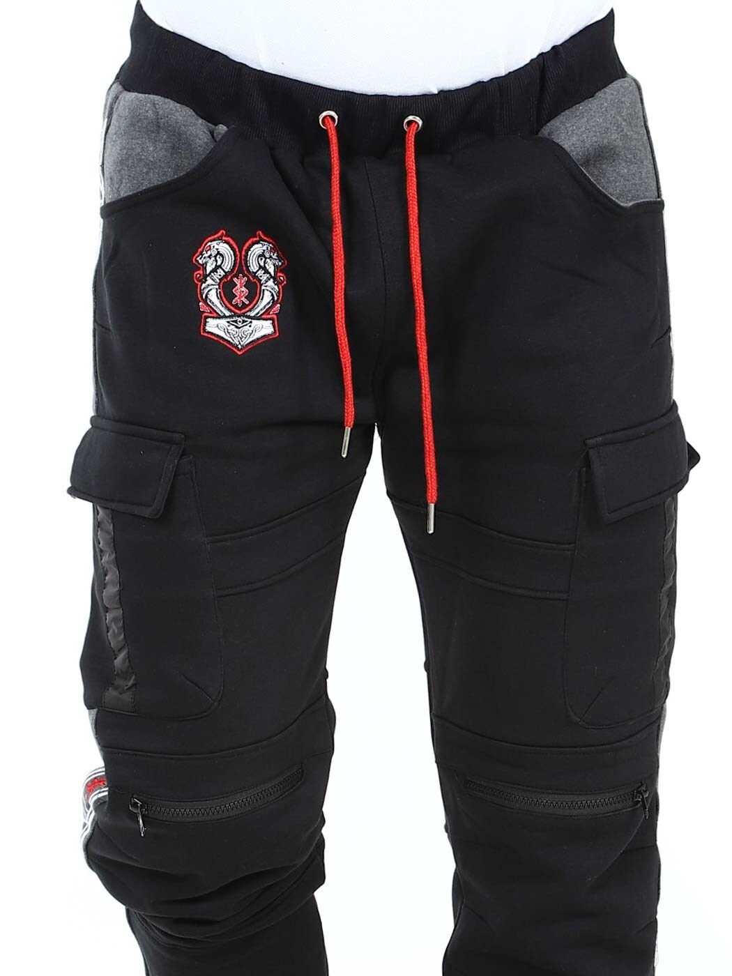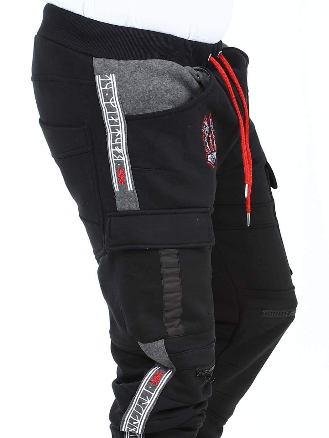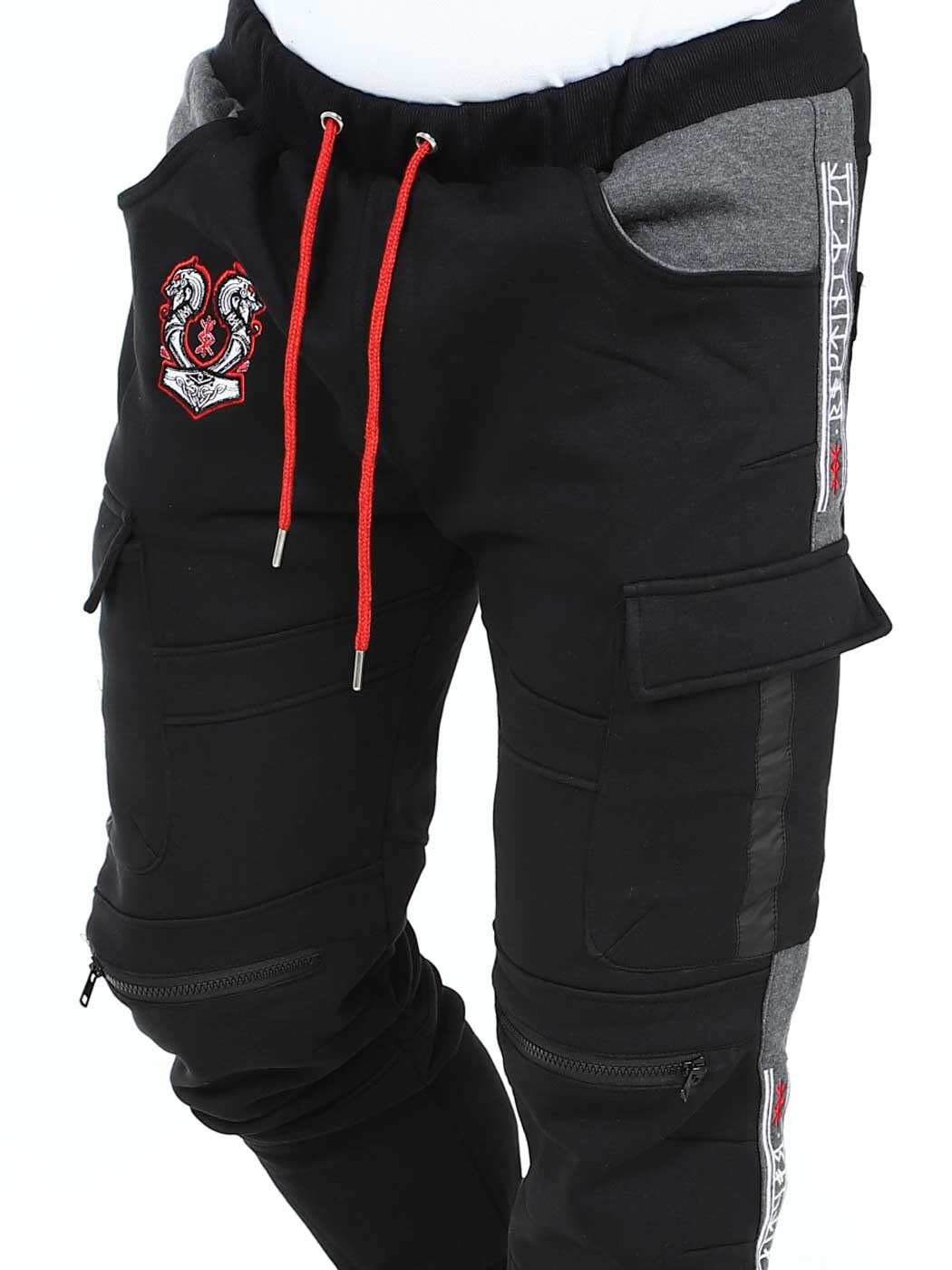 Miękkie spodnie z motywami inspirowanymi Wikingami. Posiadają kilka kieszeni oraz elastyczne ściągacze w pasie i na końcach nogawek. Zamki błyskawiczne na nogawkach z przodu, które można rozpiąć i pełnią funkcję otworów wentylacyjnych. Te wyjątkowe spodnie znajdziesz tylko w RockDenim!