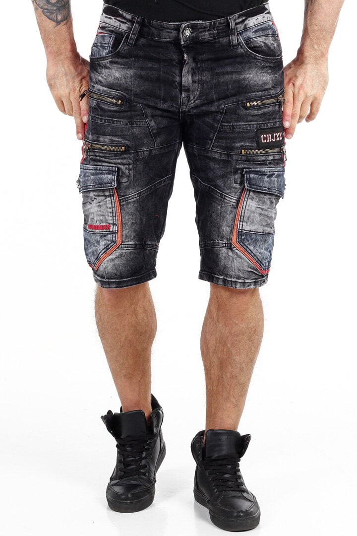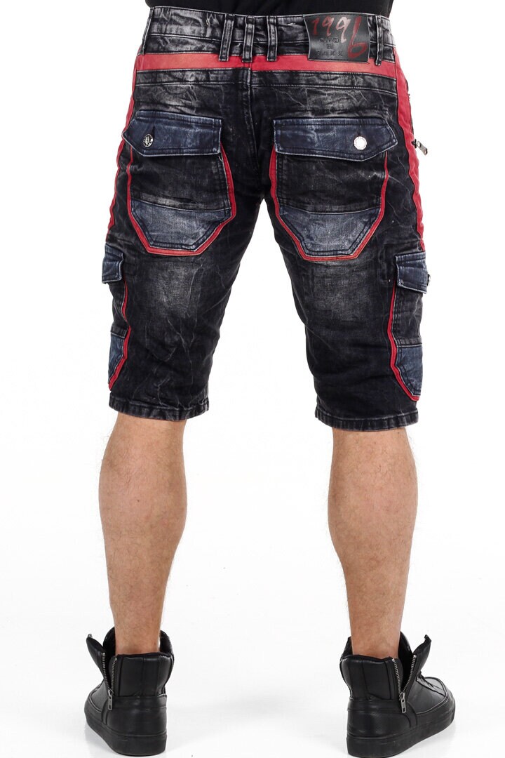 Elastyczne spodenki jeansowe w kolorze spranej czerni, z czerwonymi wstawkami i zamkami. Posiadają kieszenie cargo po bokach oraz zamykane tylne i trzy otwarte kieszenie przednie. Z tyłu w pasie duża naszywka z logo z czarnej imitacji skóry.