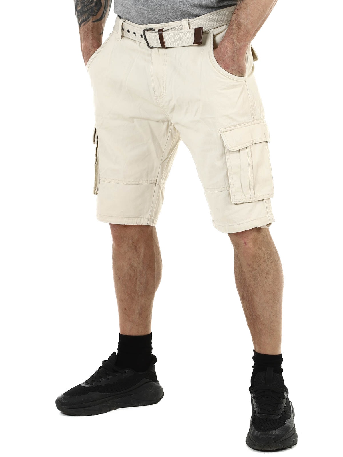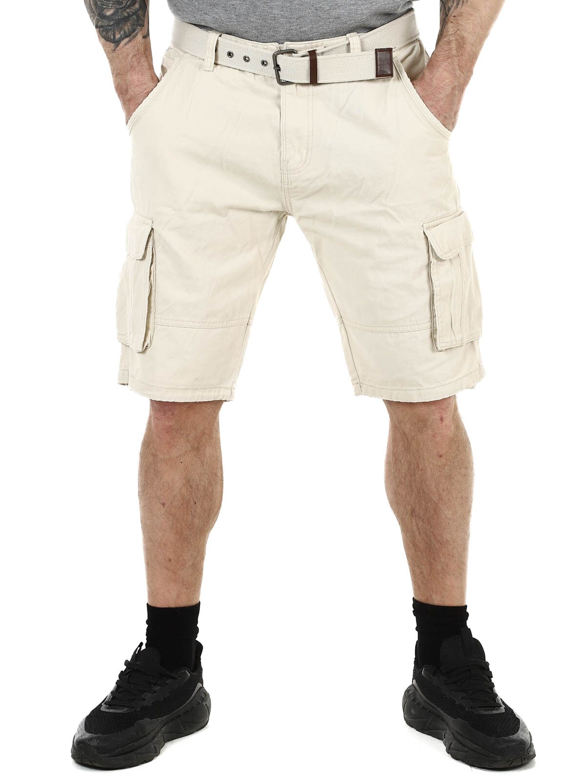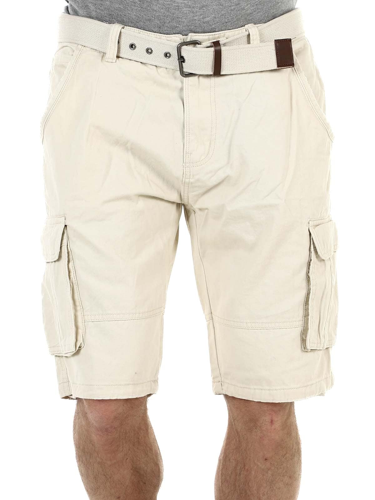 Stylowe szorty z wytrzymałej bawełny. Dużo pojemnych kieszeni, z których kilka jest zamykanych. Średniej długości model z paskiem w komplecie.