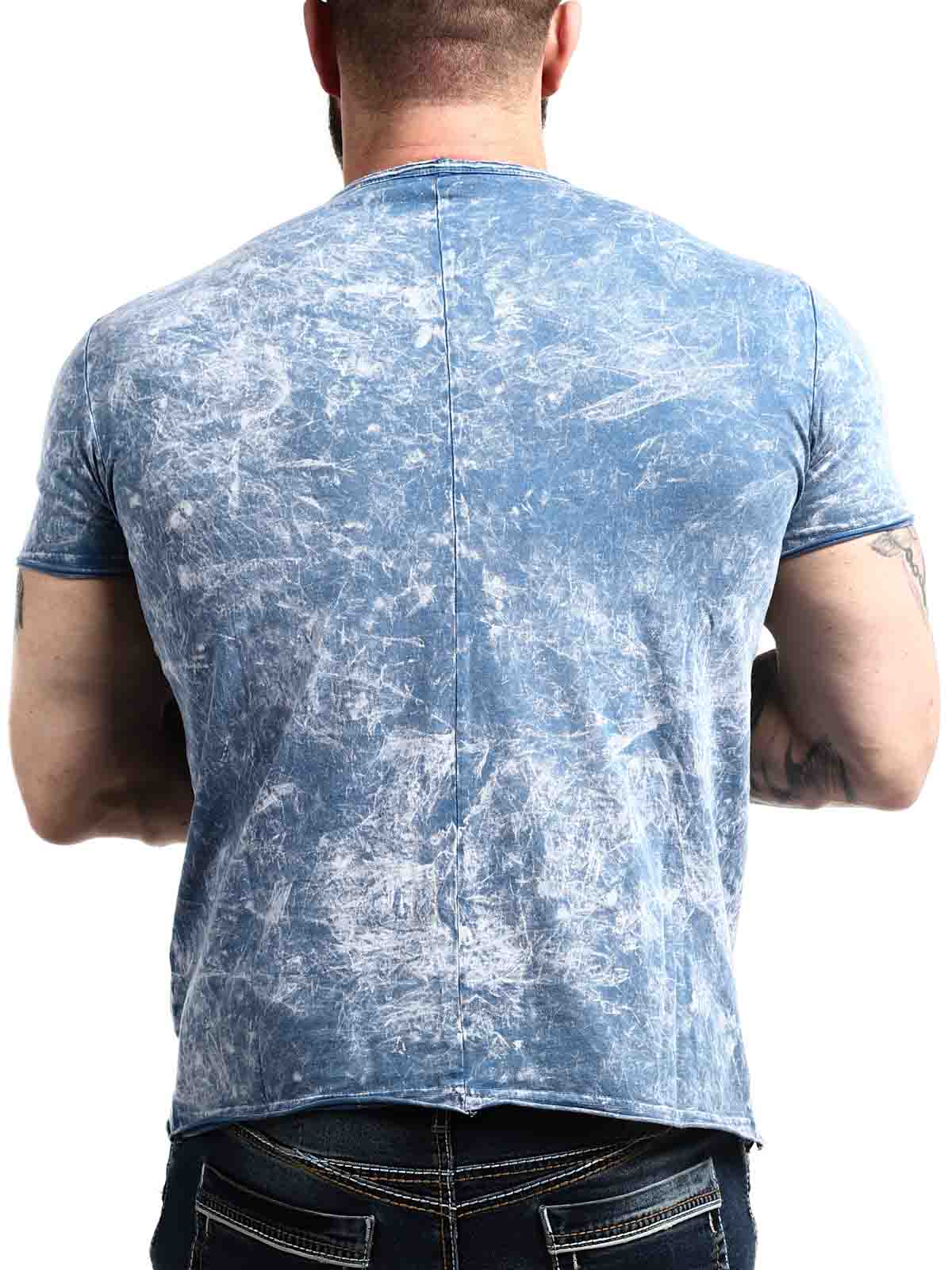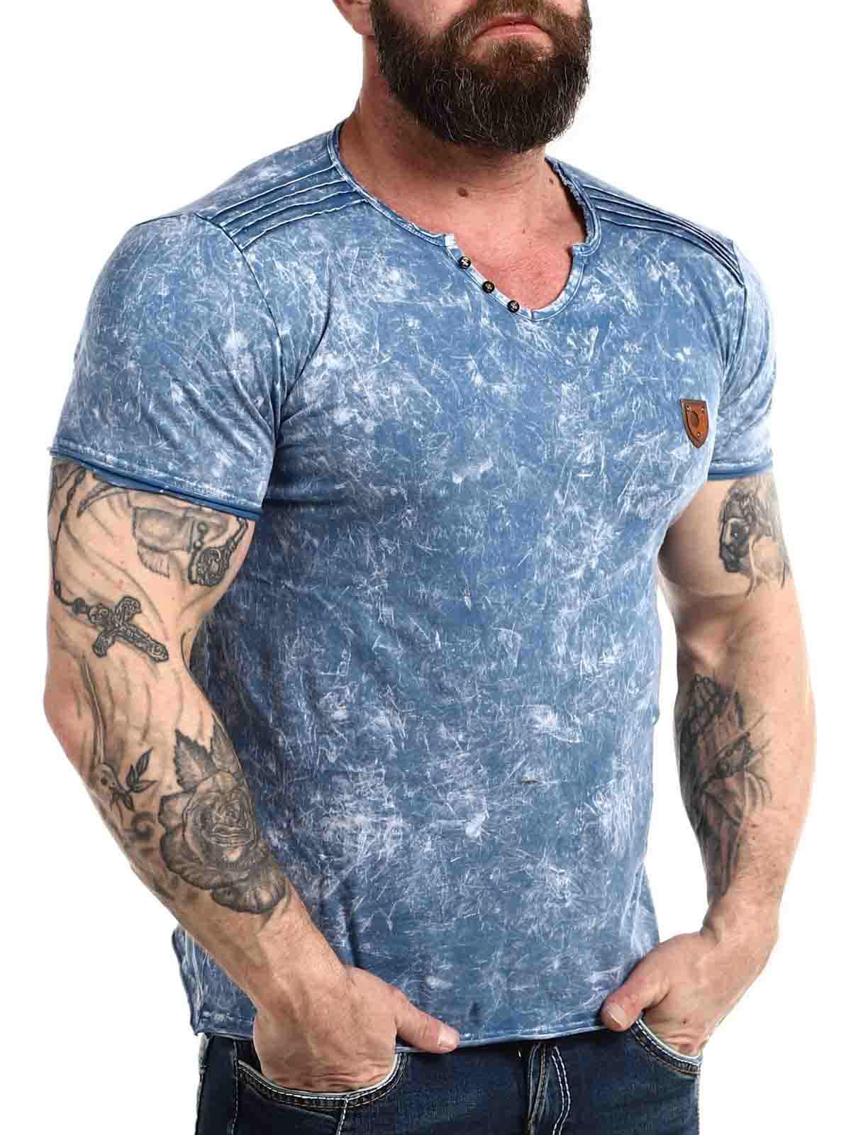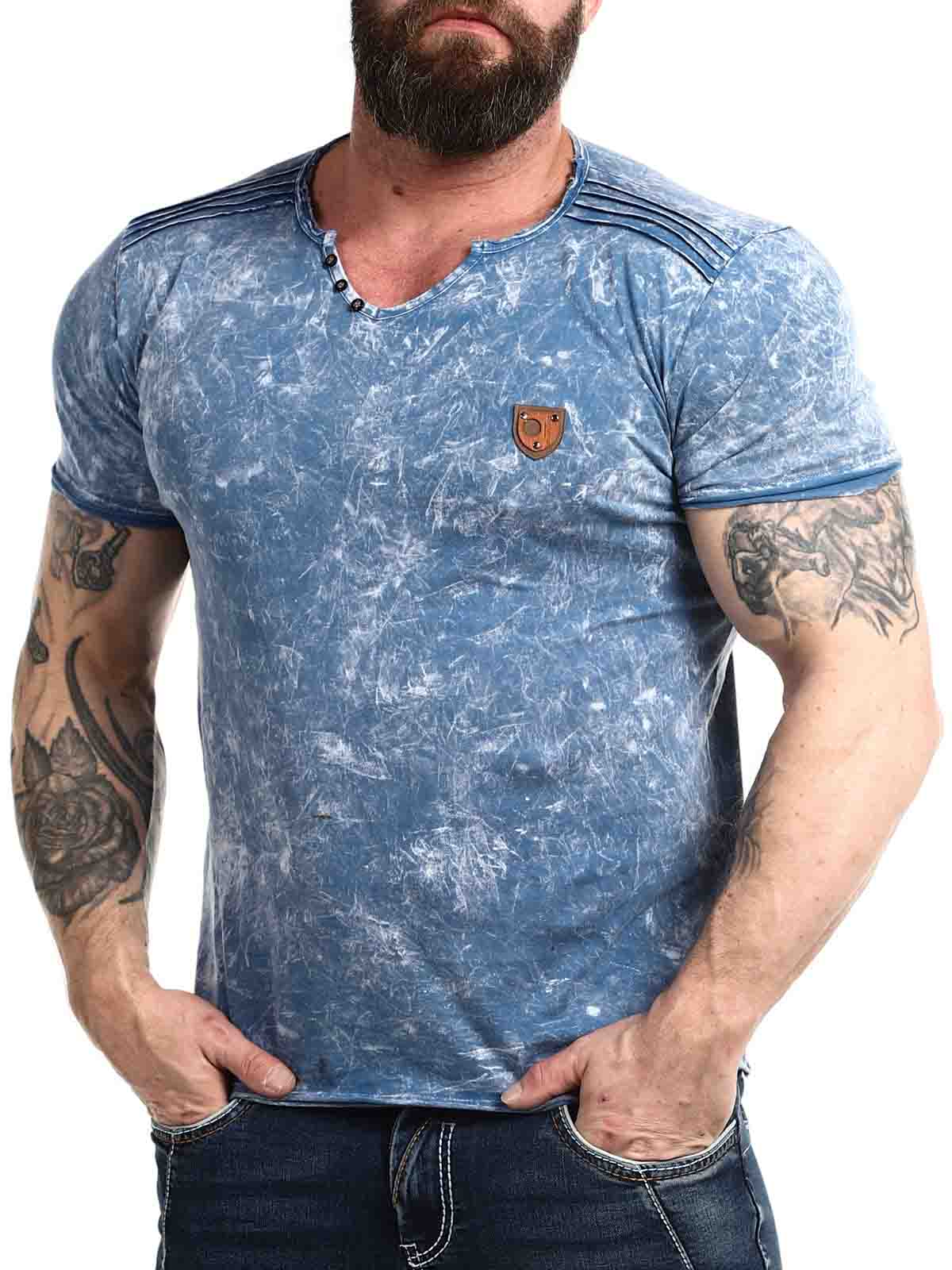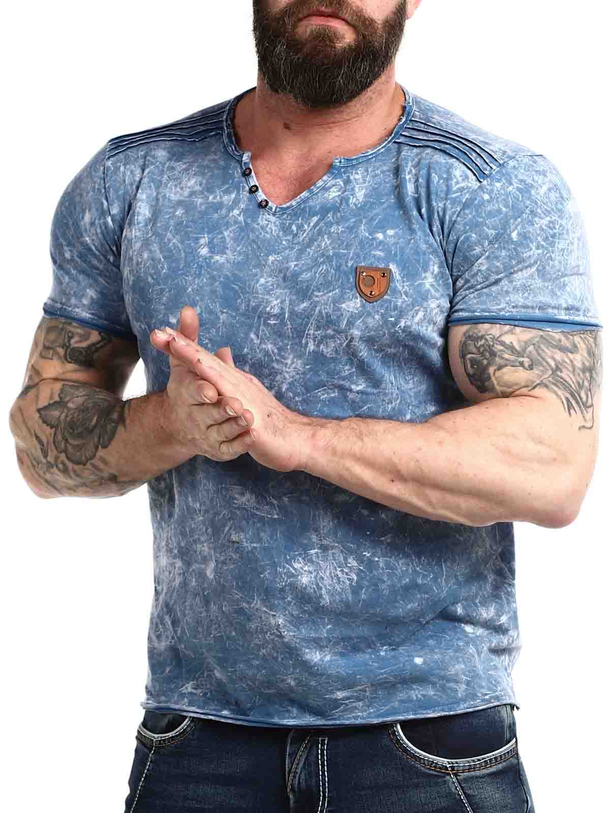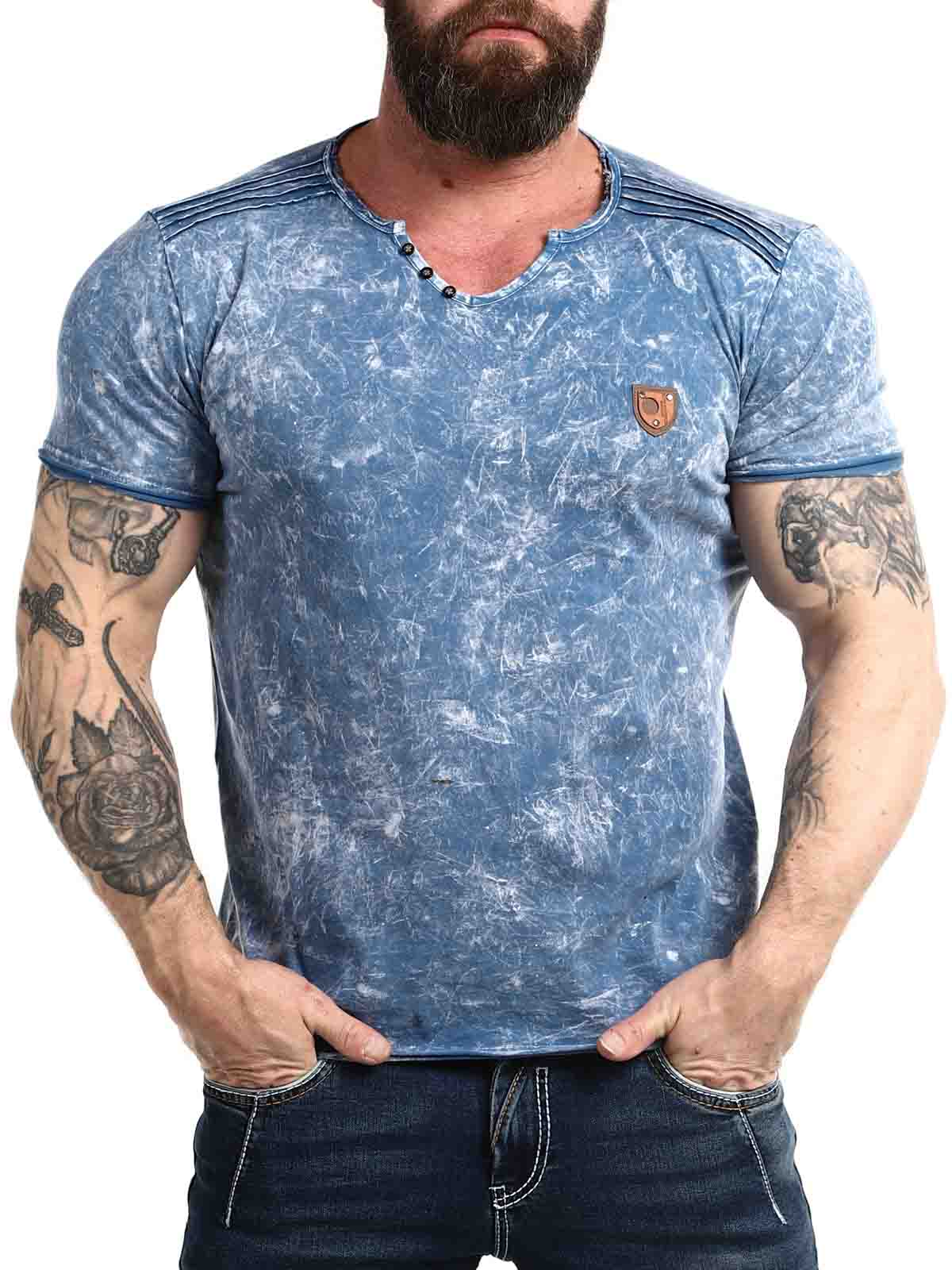 Uszyta z wygodnego i rozciagliwego materiału, niebieska koszulka z guzikami przy dekolcie. Model z zaokrąglonymi krawędziami oraz grubymi szwami, które podkreślają ramiona. Naszywka z imitacji skóry z logo po lewej stronie klatki piersiowej.