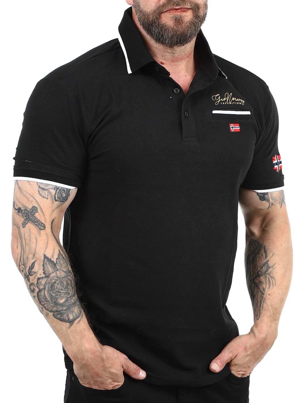 Stylowa czarna koszulka z pikowanym materiałem i dopasowanymi nadrukami w kontrastowych kolorach. Posiada kołnierzyk zapinany na guziki, kieszeń na piersi i prążkowane końcówki rękawów. Wykonana w 100% z bawełny.