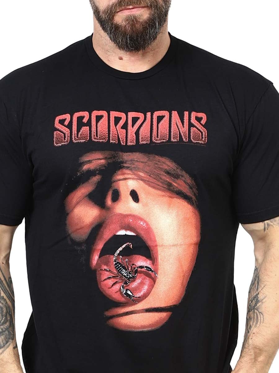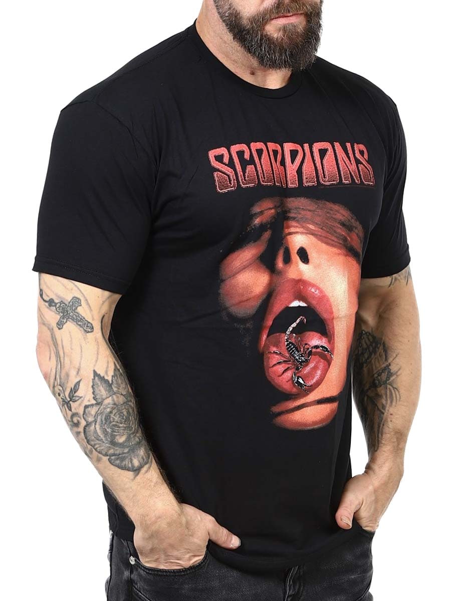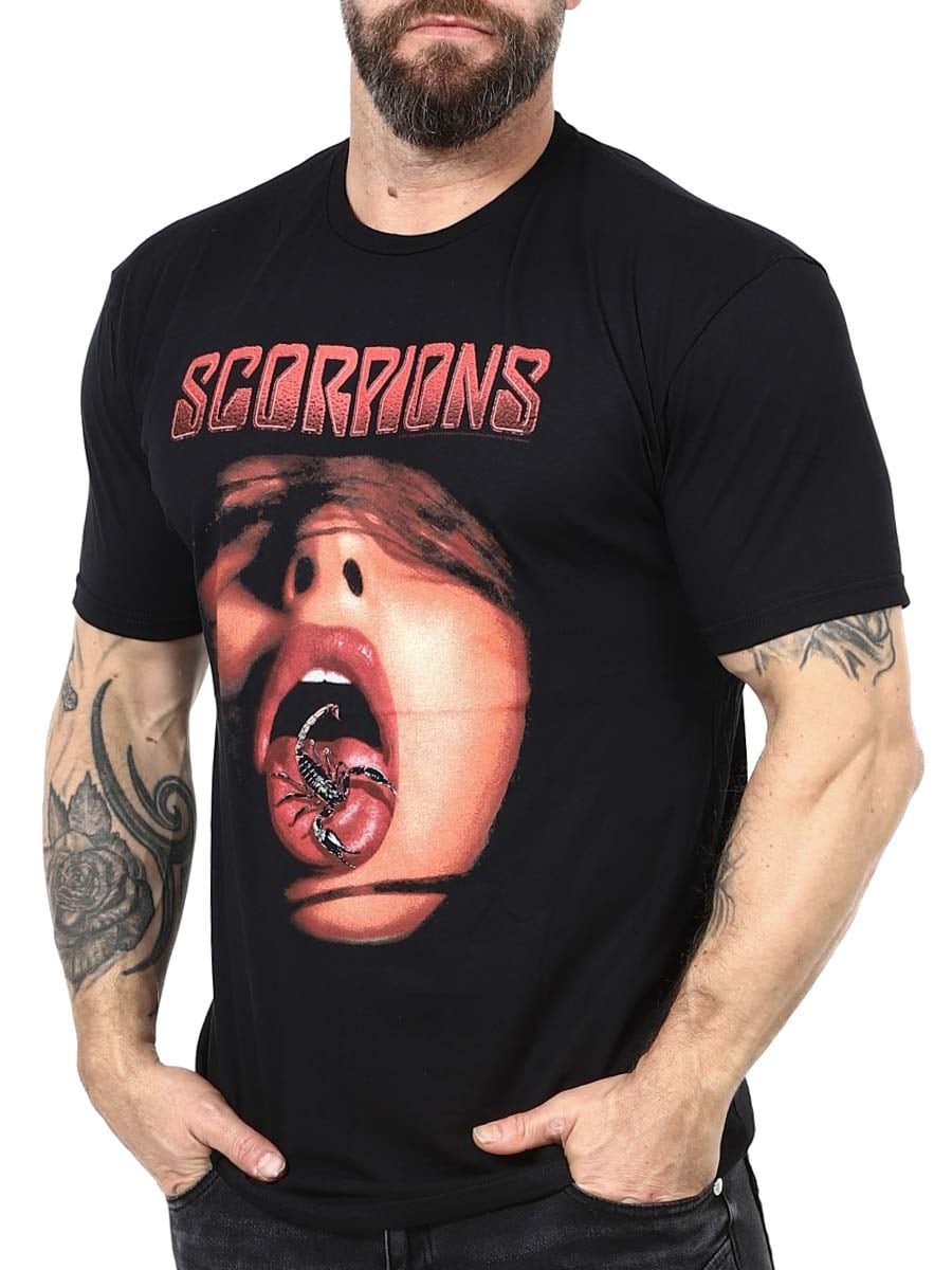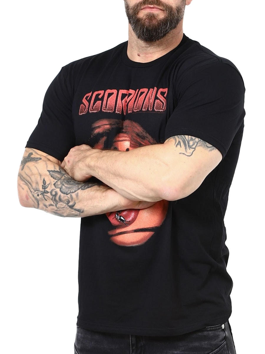 Scorpions Tongue T-shirt w kolorze czarnym to ikoniczny hołd dla legendarnego zespołu rockowego.