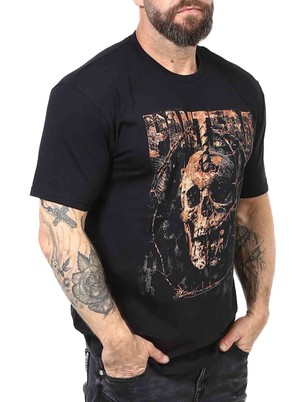 Ta koszulka to obowiązkowy element dla fanów legendarnej Pantery, z dużym, wyraźnym nadrukiem z przodu, który celebruje surową energię zespołu. Nadruk składa się z klasycznego logo "PANTERA" nad szczegółową, przerażającą czaszką otoczoną drutem kolczastym. Na plecach znajduje się potężne przesłanie "STRONGER THAN ALL" w postarzonym, pasującym stylu, również owinięte drutem kolczastym. Wykonana w 100% z miękkiej bawełny i skrojona w stylu Regular Fit, ta koszulka oferuje zarówno komfort, jak i autentyczny rockowy wygląd. Idealna na koncerty, festiwale lub jako część Twojej codziennej metalowej garderoby.