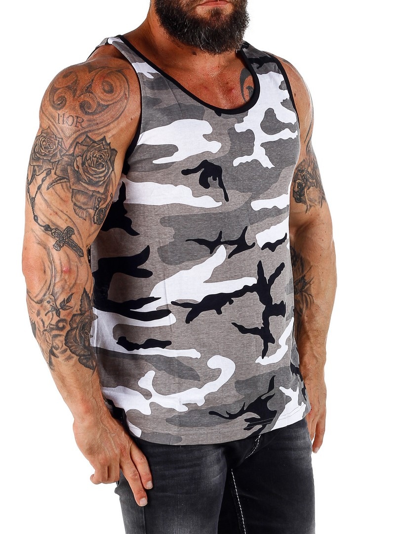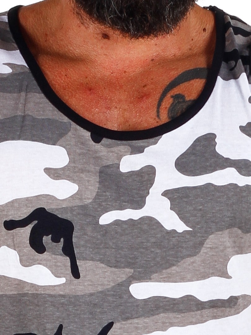 Szary podkoszulek moro. Czarne wykończenie przy szyi i ramionach. Luźniejszy dół.