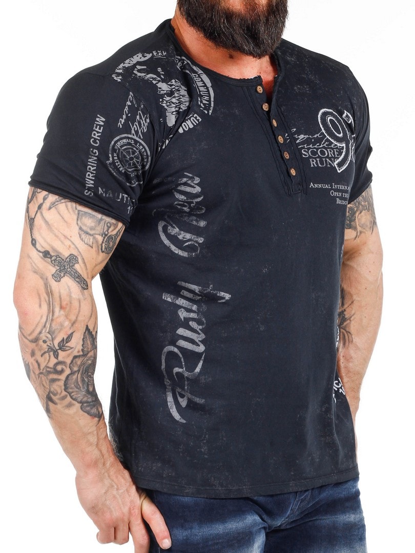 Czarna koszulka z miękkiej bawełny ze srebrnym nadrukiem z przodu. Regularny krój z wydatnym dekoltem, zapinanym na guziki. Dyskretna naszywka w kolorze brązowym na lewym ramieniu.
