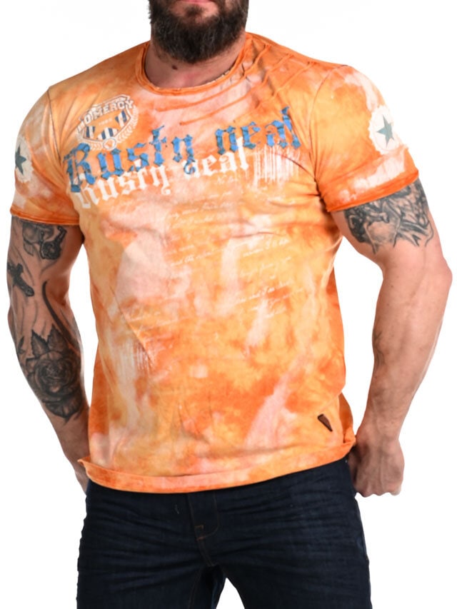 Ciekawy t-shirt z efektem cieniowania, z przeszyciami na ramieniu i nadrukiem z przodu oraz na rękawach. Prosty model z okrągłym dekoltem i dyskretną naszywką z logo na dole.
