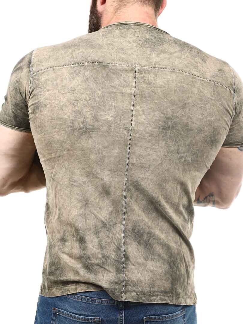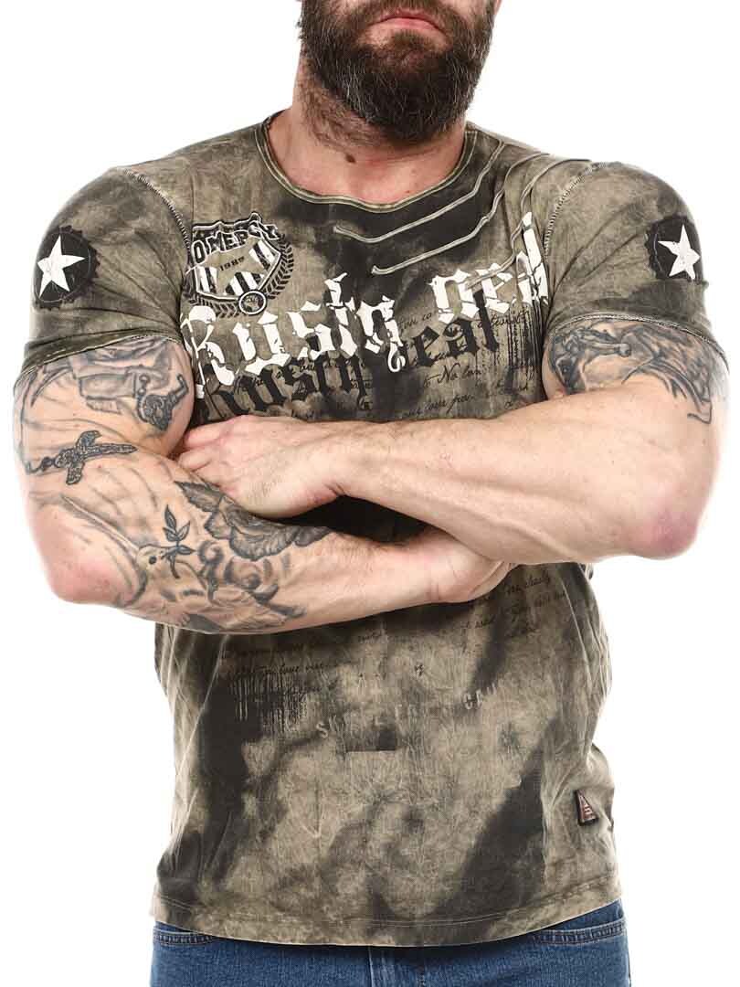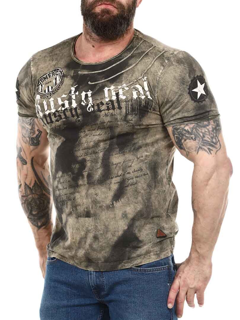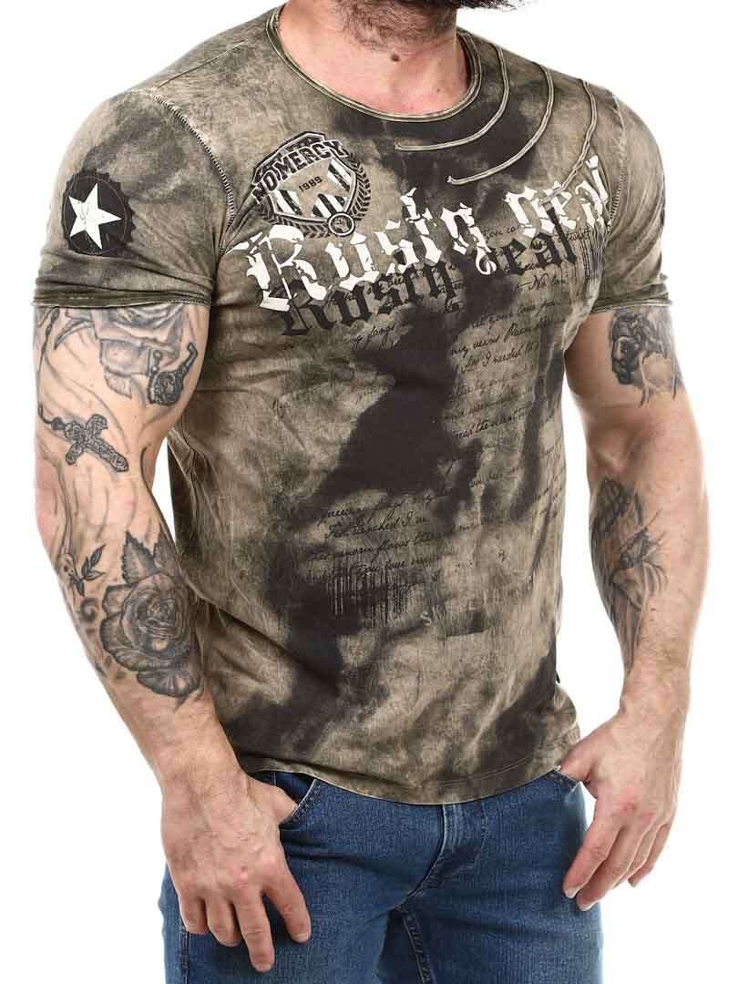 Ciekawy t-shirt z efektem cieniowania, z przeszyciami na ramieniu i nadrukiem z przodu oraz na rękawach. Prosty model z okrągłym dekoltem i dyskretną naszywką z logo na dole.