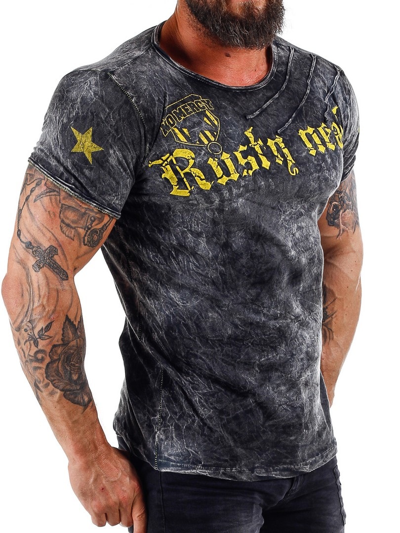 Ciekawy t-shirt z efektem cieniowania, z przeszyciami na ramieniu i nadrukiem z przodu oraz na rękawach. Prosty model z okrągłym dekoltem i dyskretną naszywką z logo na dole.