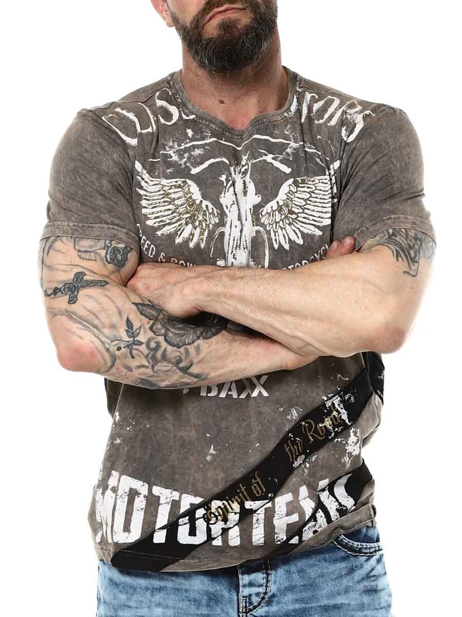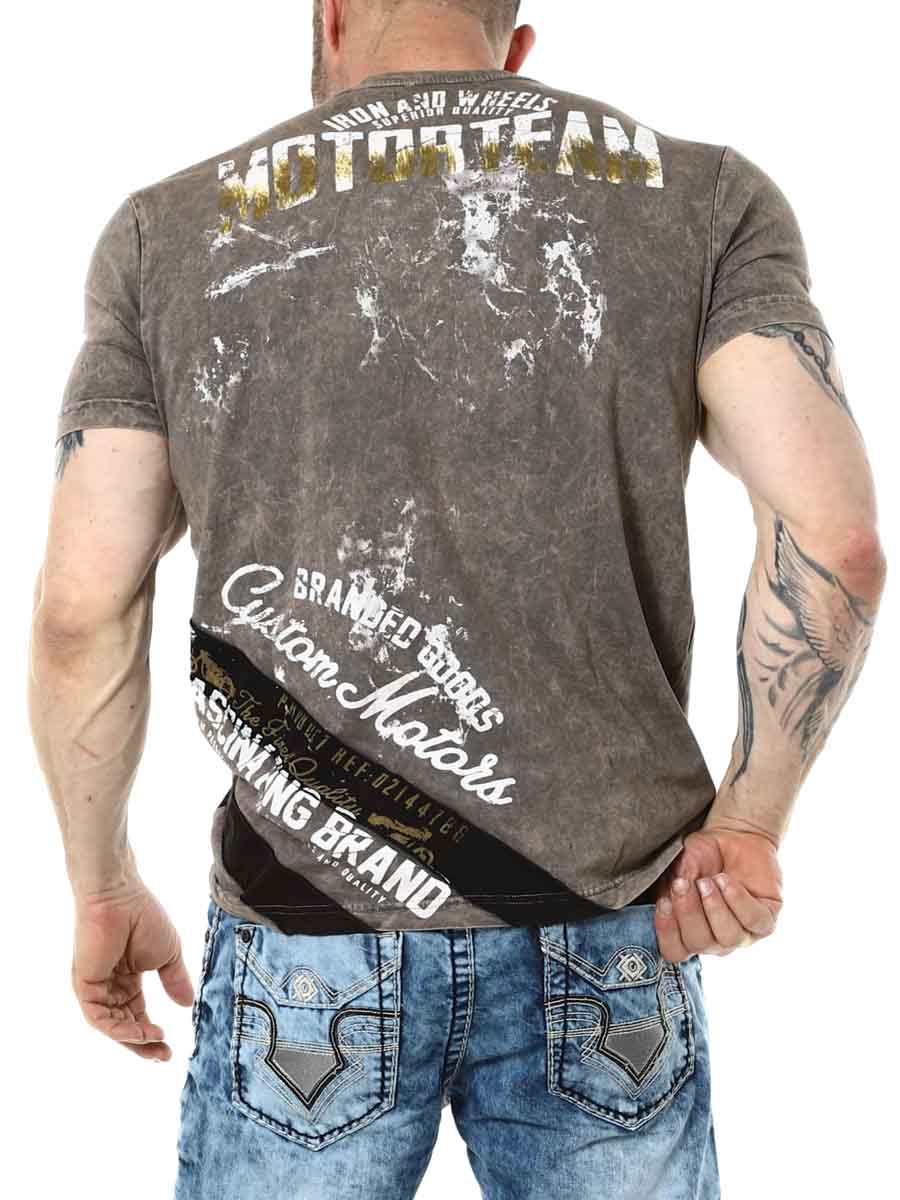Stylowa koszulka z cienkiego i elastycznego materiału. Mocny design z nadrukiem motocyklowym i przeszyciami. Okrągły dekolt.