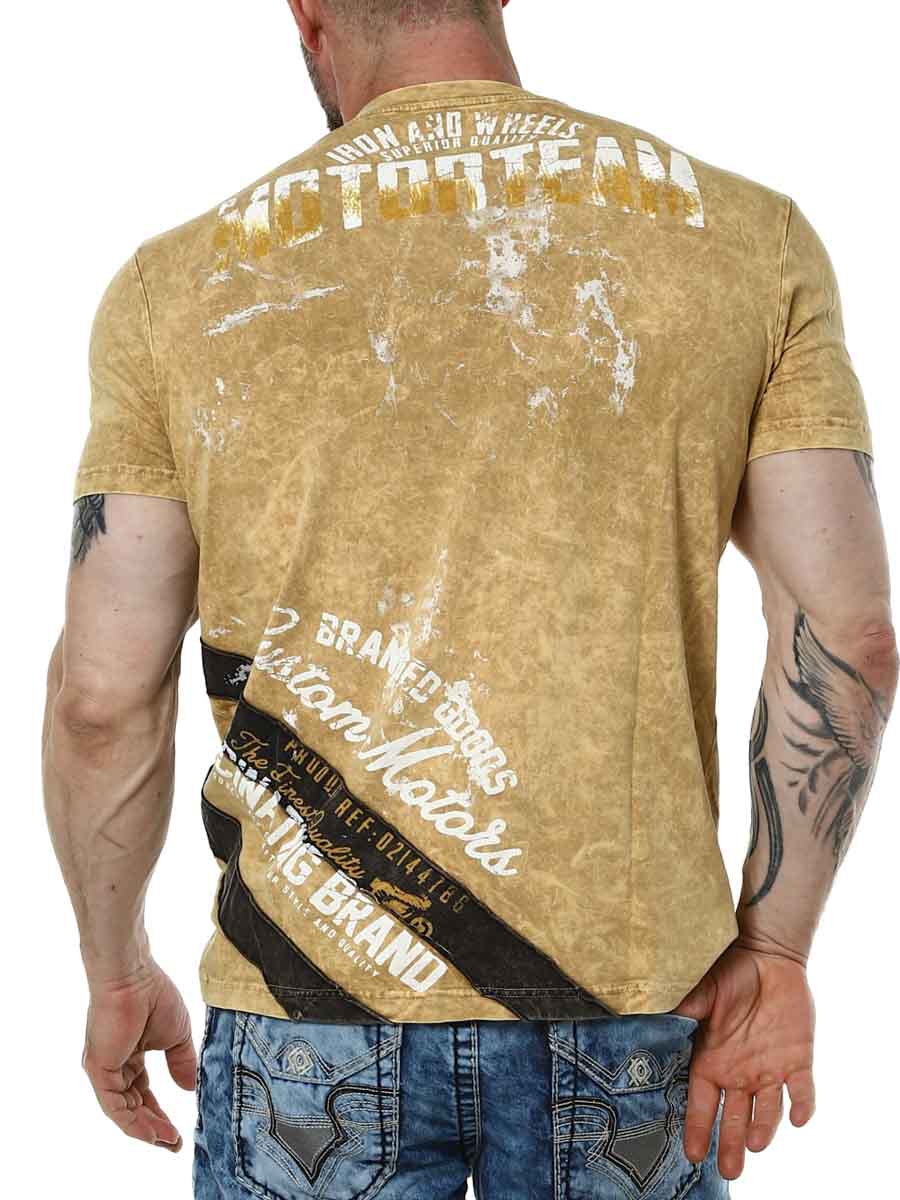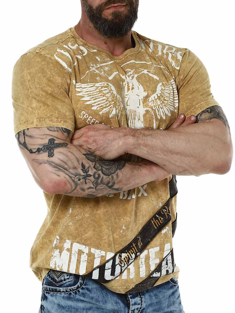 Stylowa koszulka z cienkiego i elastycznego materiału. Mocny design z nadrukiem motocyklowym i przeszyciami. Okrągły dekolt.