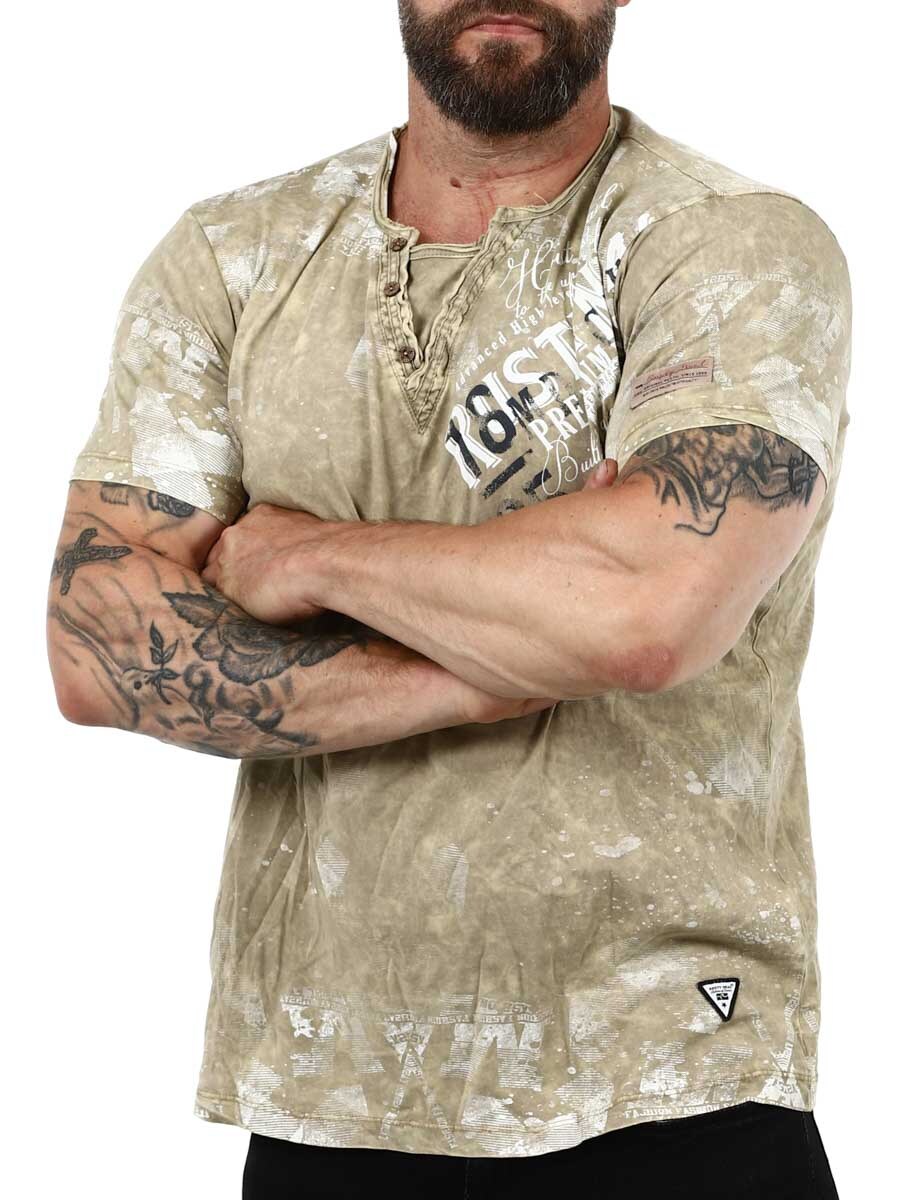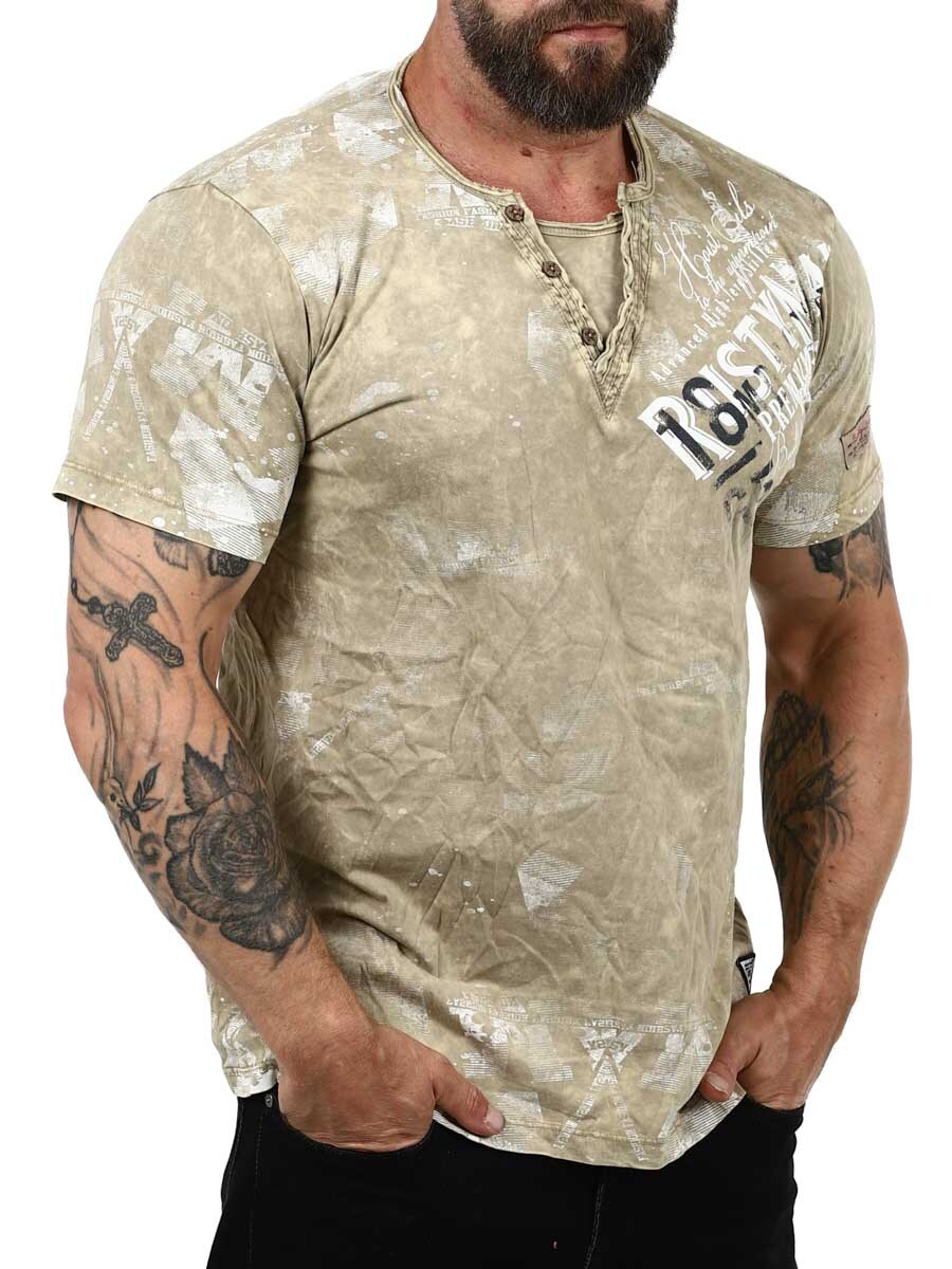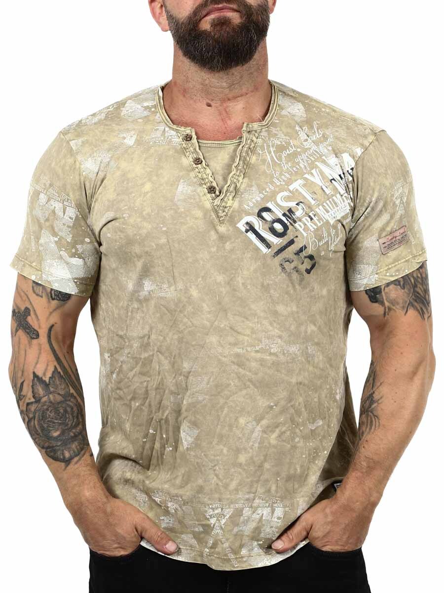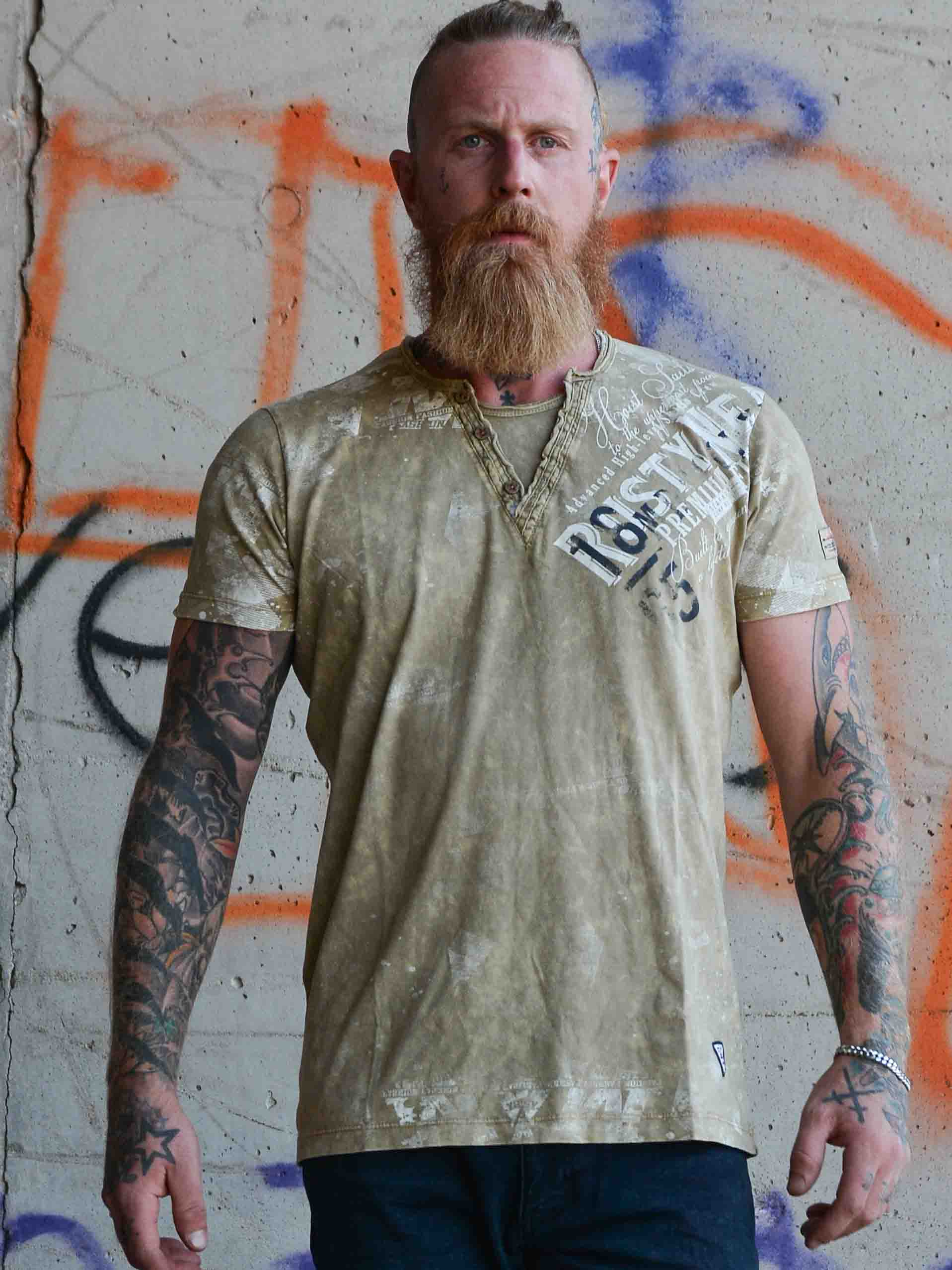 Czarna koszulka z jasnymi wzorami i nadrukami tekstowymi w kolorze czarno-szarym. Posiada ciekawe detale w postaci guzików przy dekolcie oraz naszywek z logo na lewym rękawie i na dole. Uszyta z miękkiej i rozciągliwej bawełny, dzięki czemu świetnie układa sie na ciele!