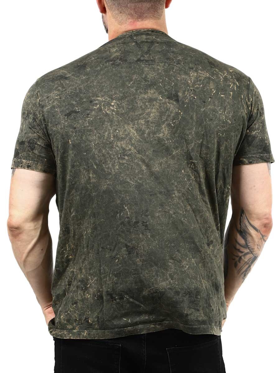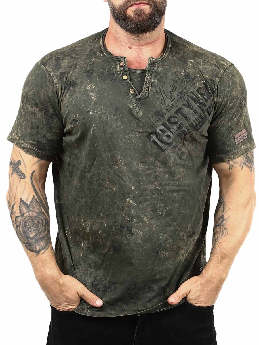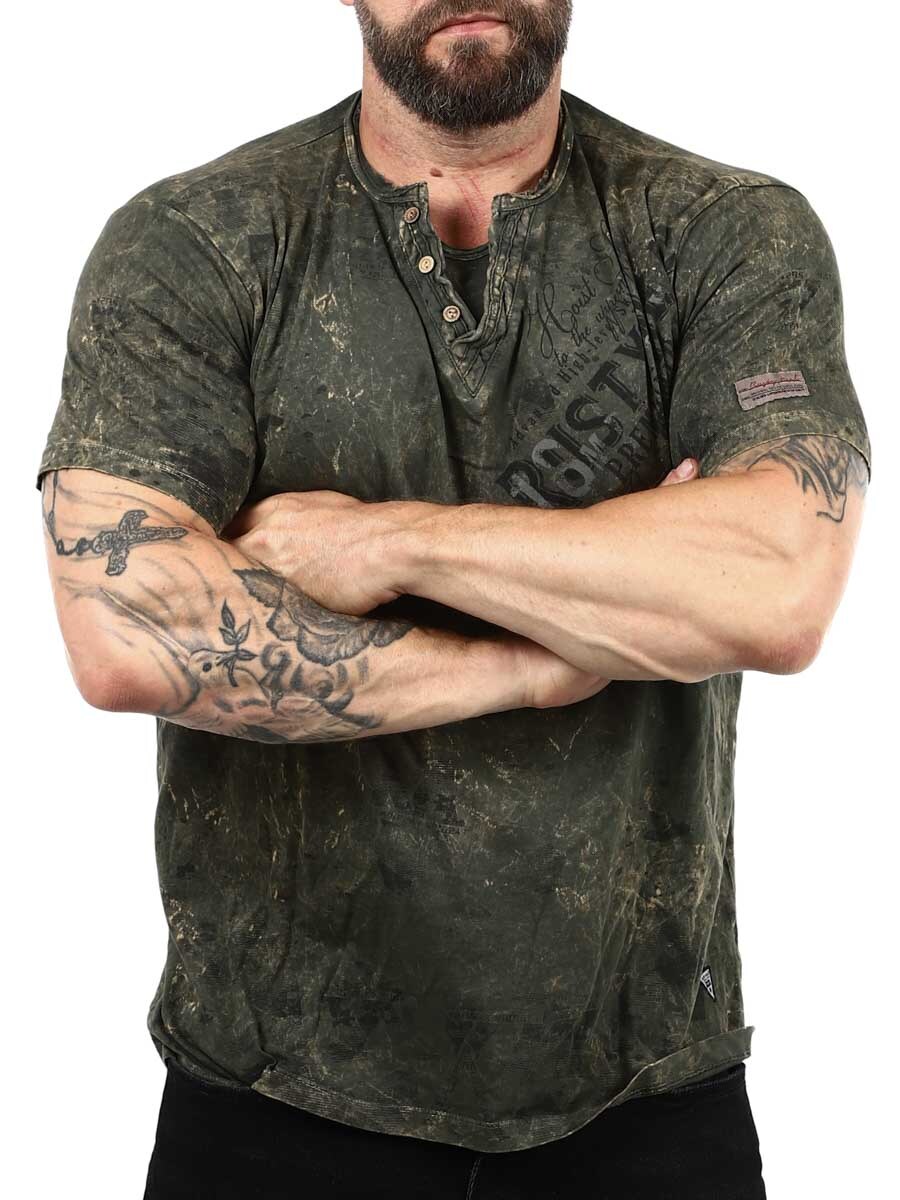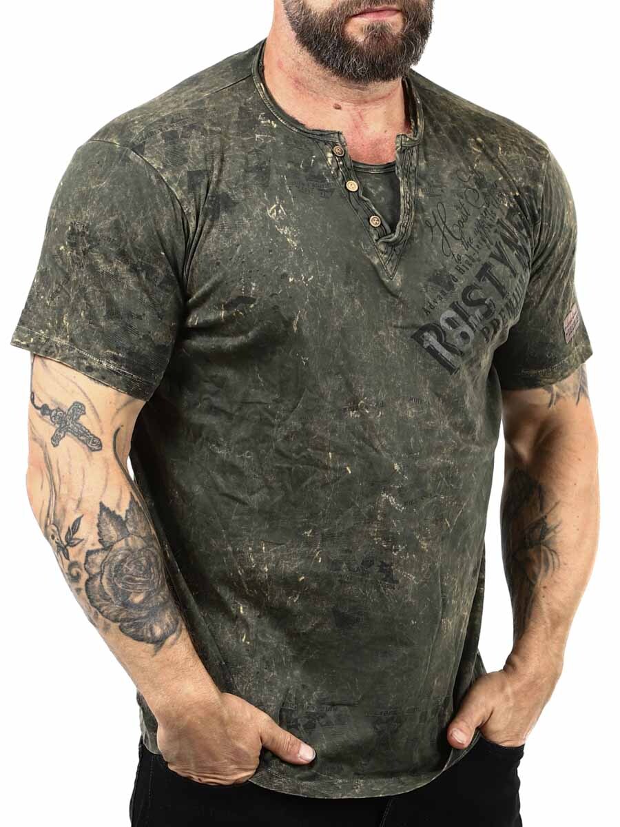 Czarna koszulka z jasnymi wzorami i nadrukami tekstowymi w kolorze czarno-szarym. Posiada ciekawe detale w postaci guzików przy dekolcie oraz naszywek z logo na lewym rękawie i na dole. Uszyta z miękkiej i rozciągliwej bawełny, dzięki czemu świetnie układa sie na ciele!