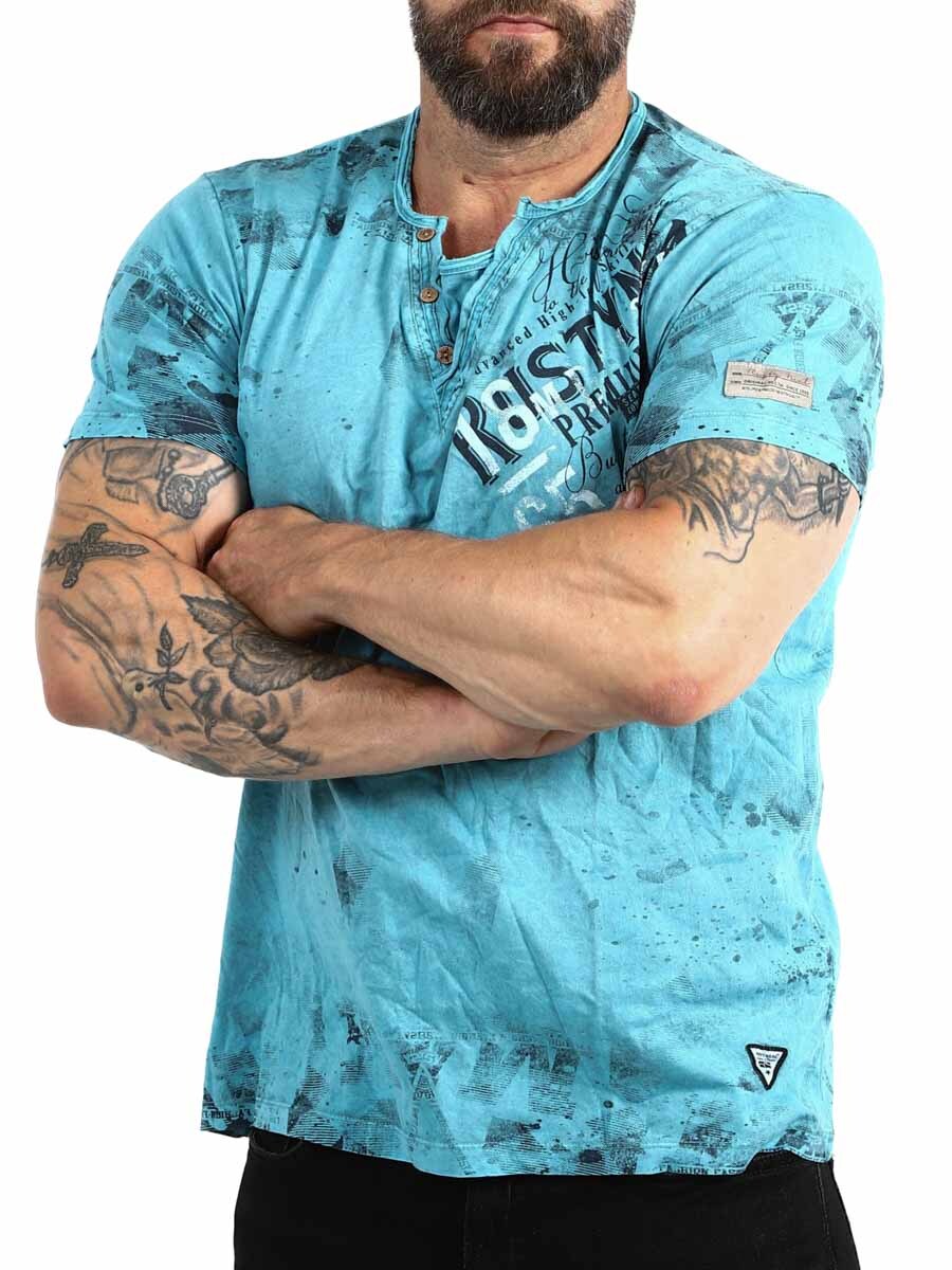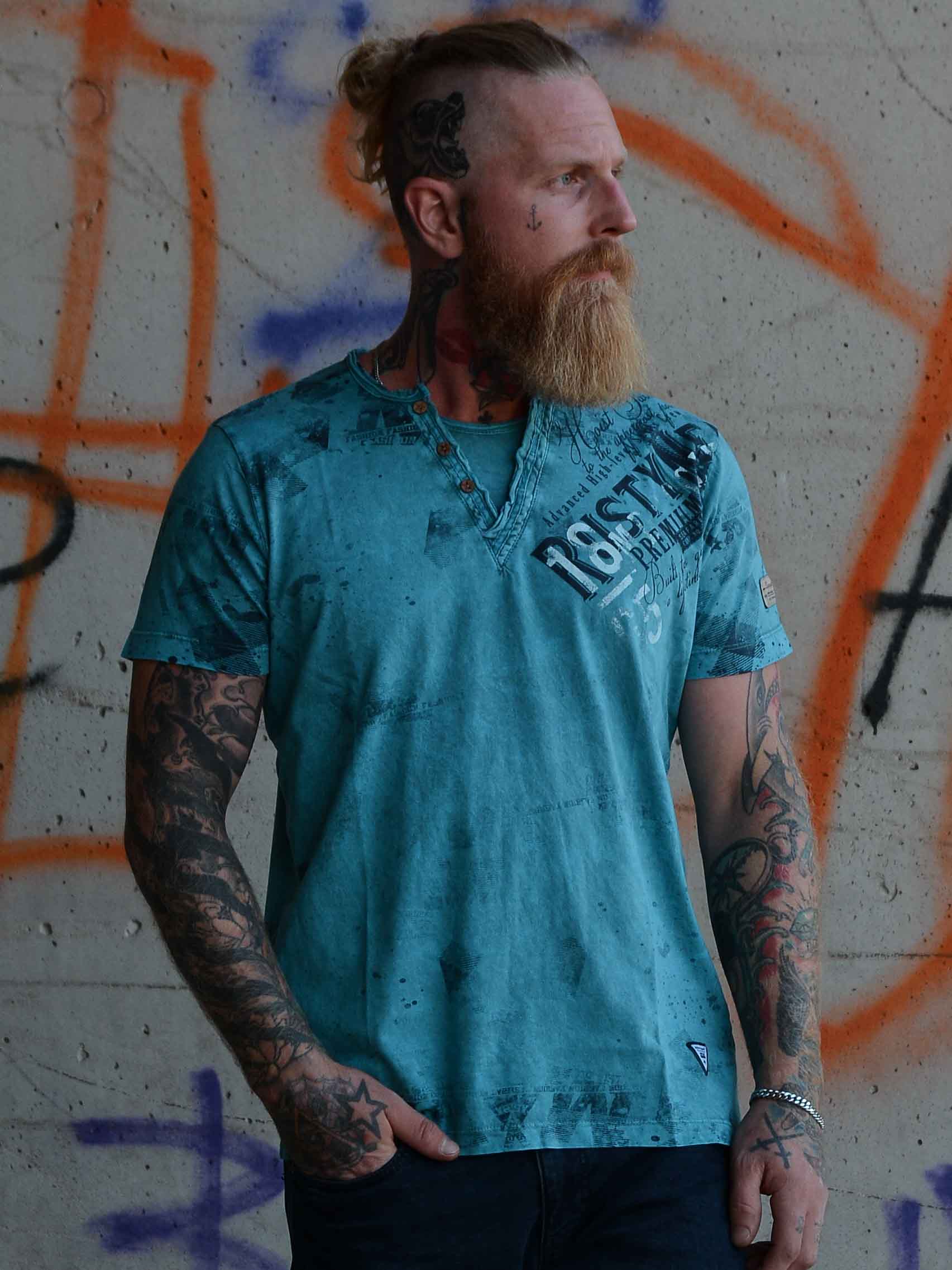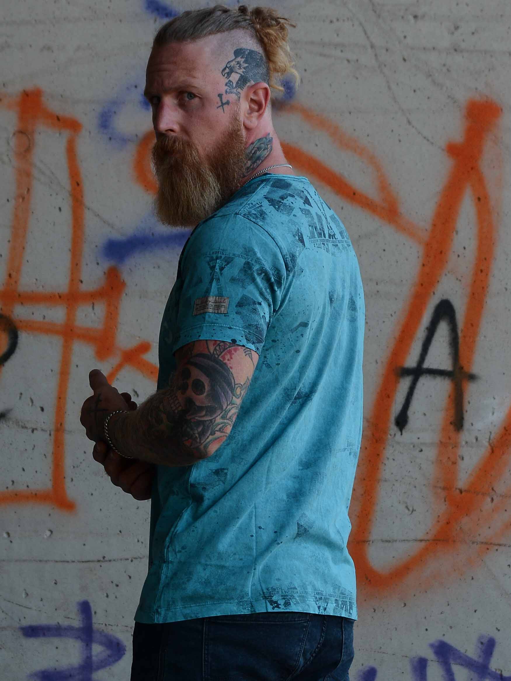 Czarna koszulka z jasnymi wzorami i nadrukami tekstowymi w kolorze czarno-szarym. Posiada ciekawe detale w postaci guzików przy dekolcie oraz naszywek z logo na lewym rękawie i na dole. Uszyta z miękkiej i rozciągliwej bawełny, dzięki czemu świetnie układa sie na ciele!