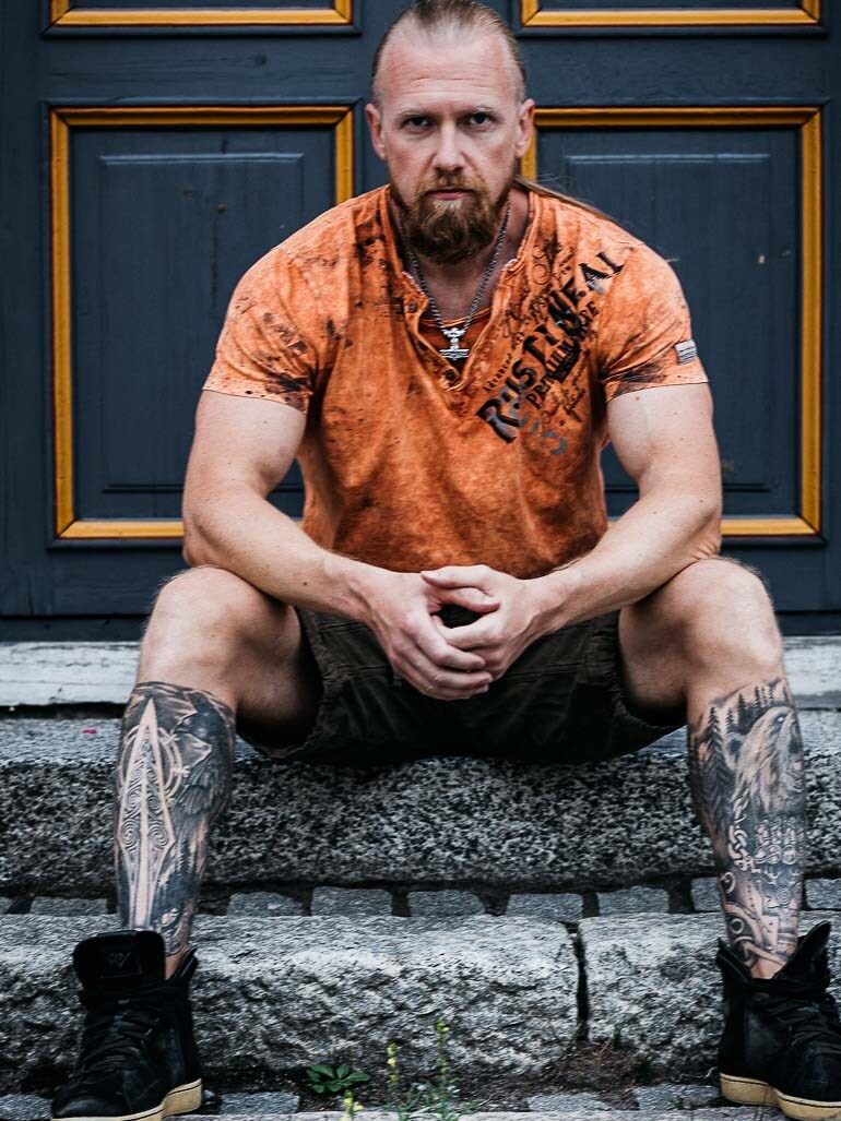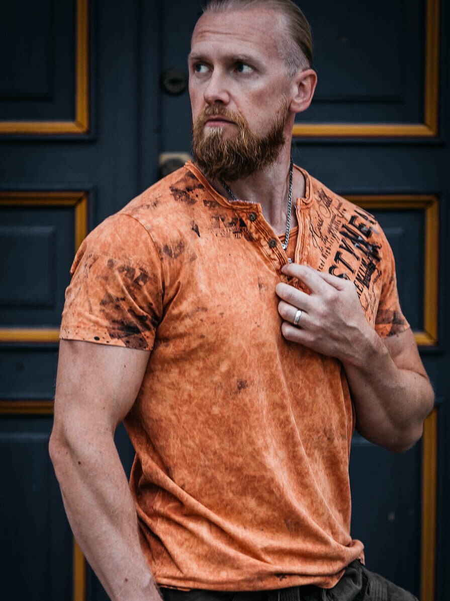 Pomarańczowa koszulka z jasnymi wzorami i nadrukami tekstowymi w kolorze czarno-szarym. Posiada ciekawe detale w postaci guzików przy dekolcie oraz naszywek z logo na lewym rękawie i na dole. Uszyta z miękkiej i rozciągliwej bawełny, dzięki czemu świetnie układa sie na ciele!