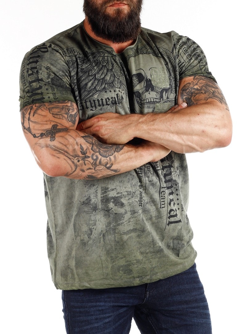Szary t-shirt w ciemniejszych odcieniach, z zaokrąglonym dekoltem oraz nadrukami graficznymi i tekstowymi w kolorze czarnym. Wykonany z miękkiej bawełny z dodatkiem stretchu, dzięki czemu wygodnie leży na ciele.