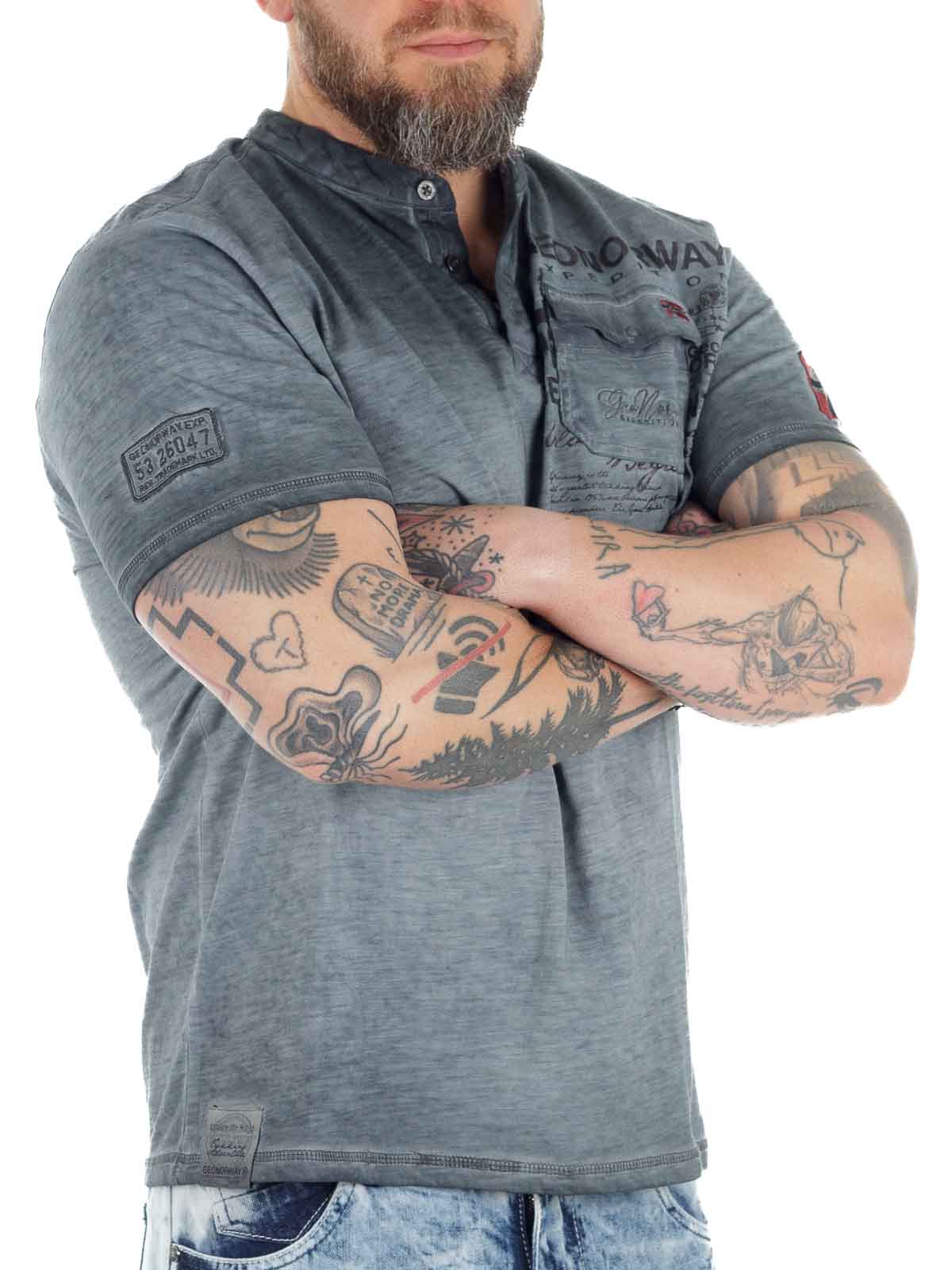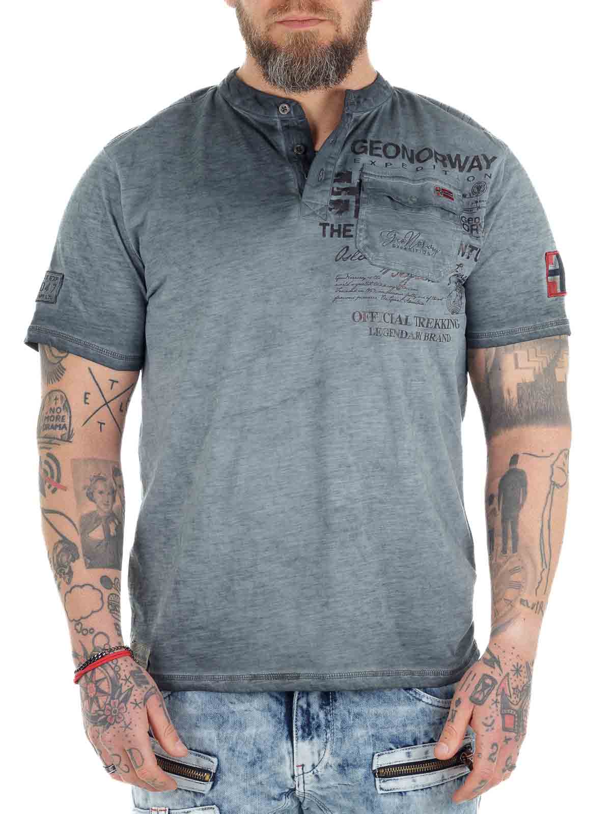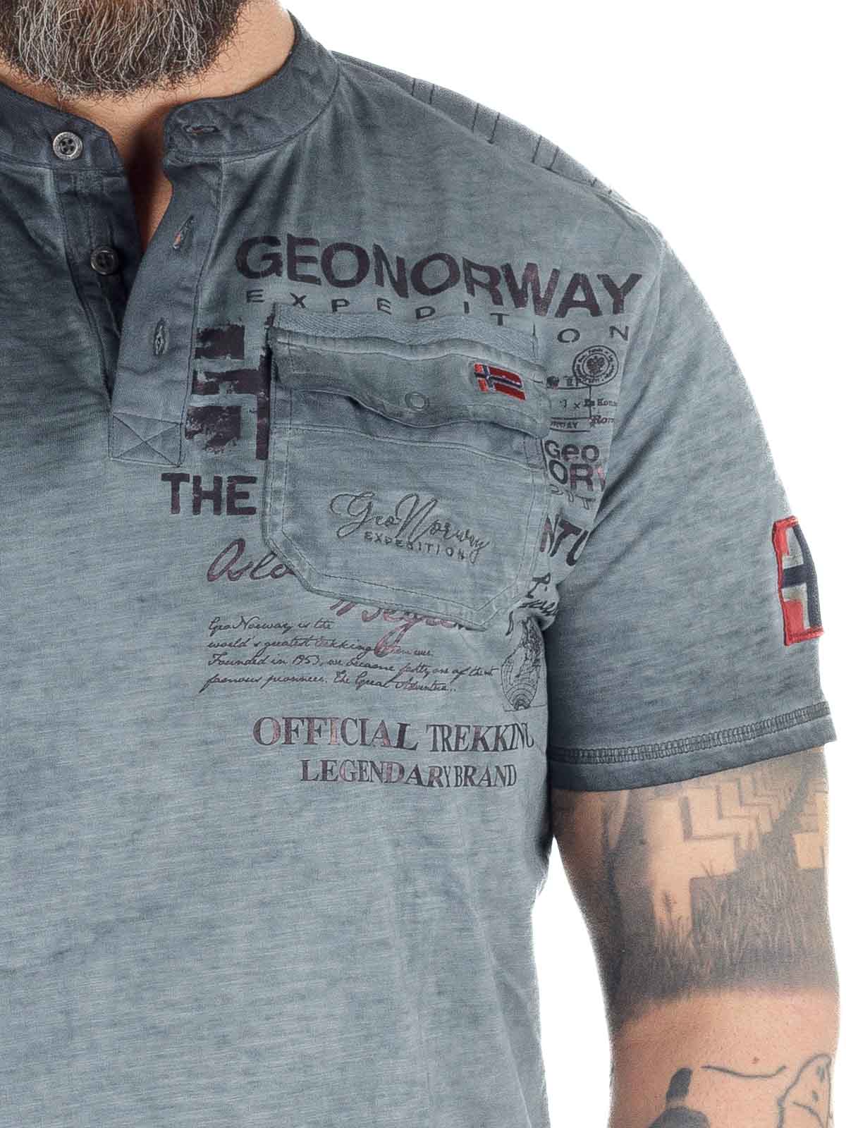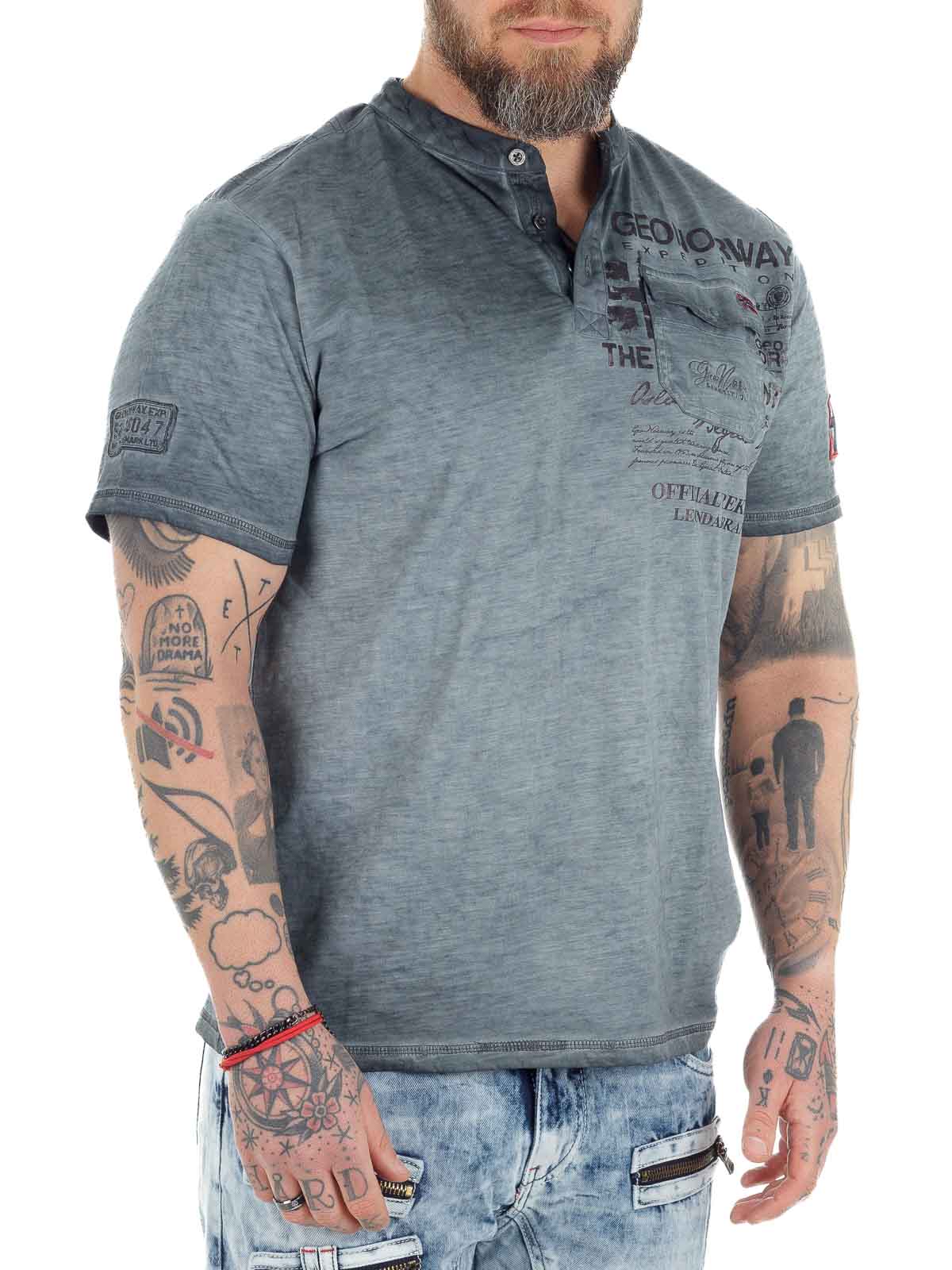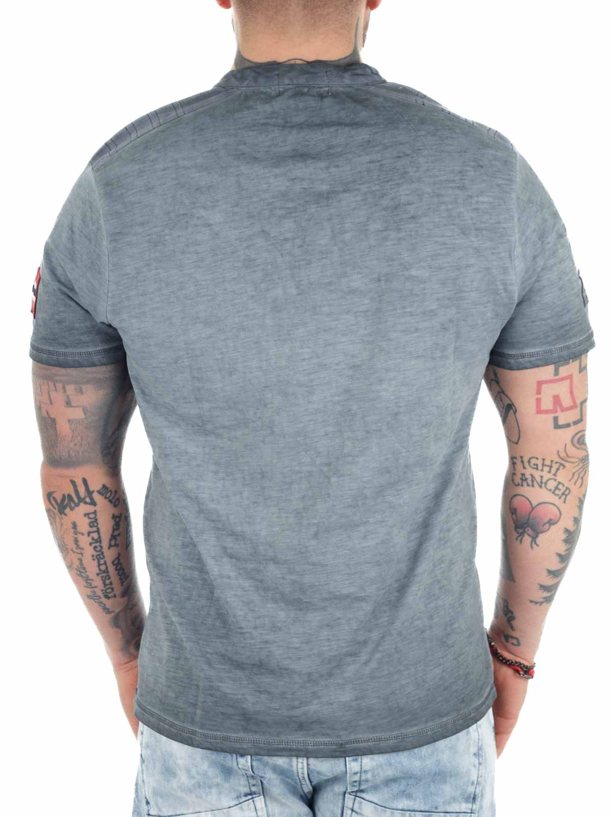 T-shirt zaprojektowany z nadrukiem, naszywkami oraz kieszonką na piersi. Ma klasyczny krój i zapięcie na guziki przy dekolcie. Wykonany w 100% z bawełny.