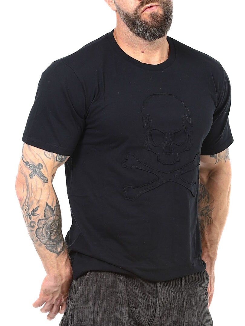 Wornstar Black Skull T-shirt i czerni to ręcznie wykonana koszulka bawełniana z unikalną aplikacją czaszki ton w ton.