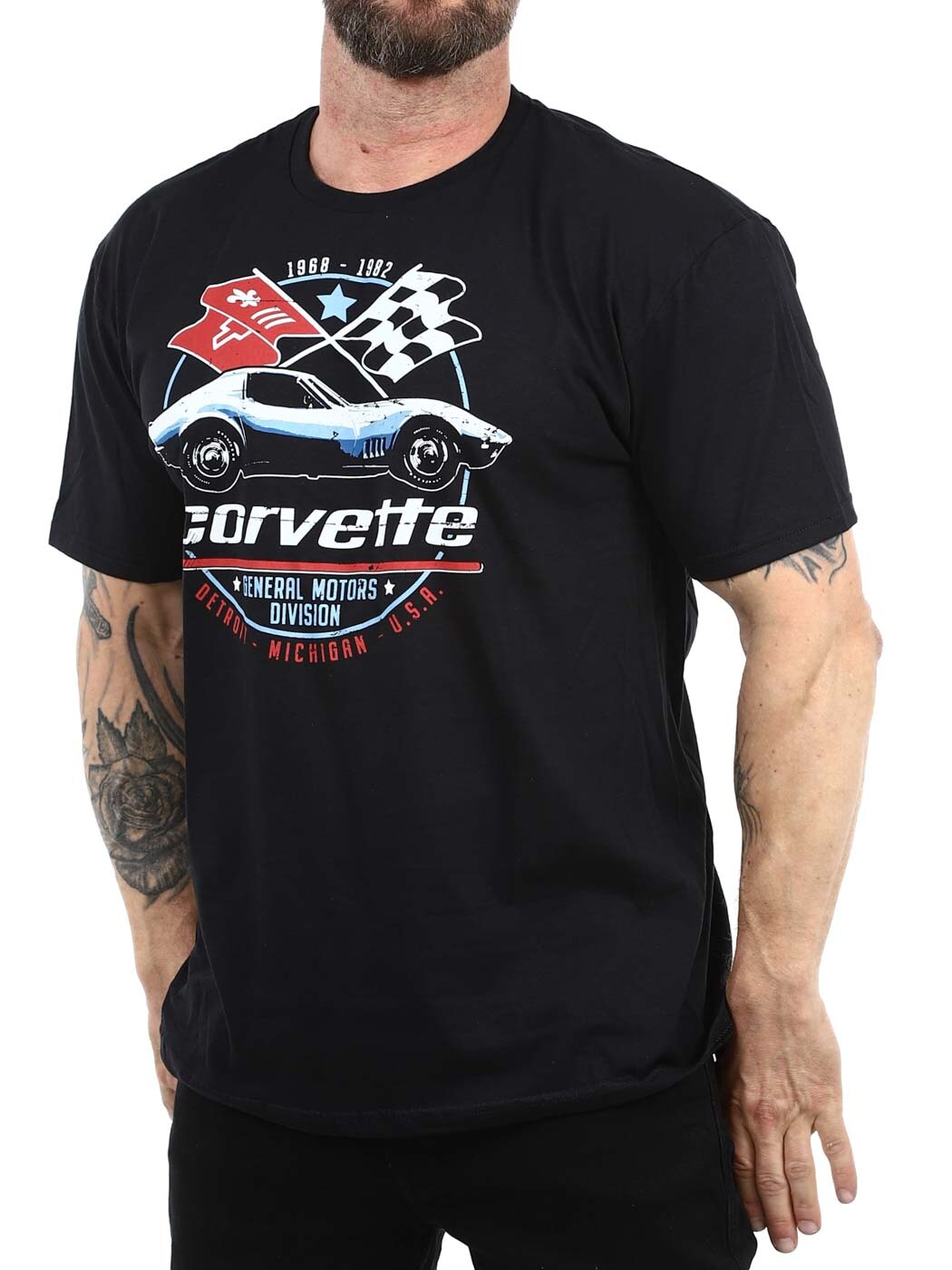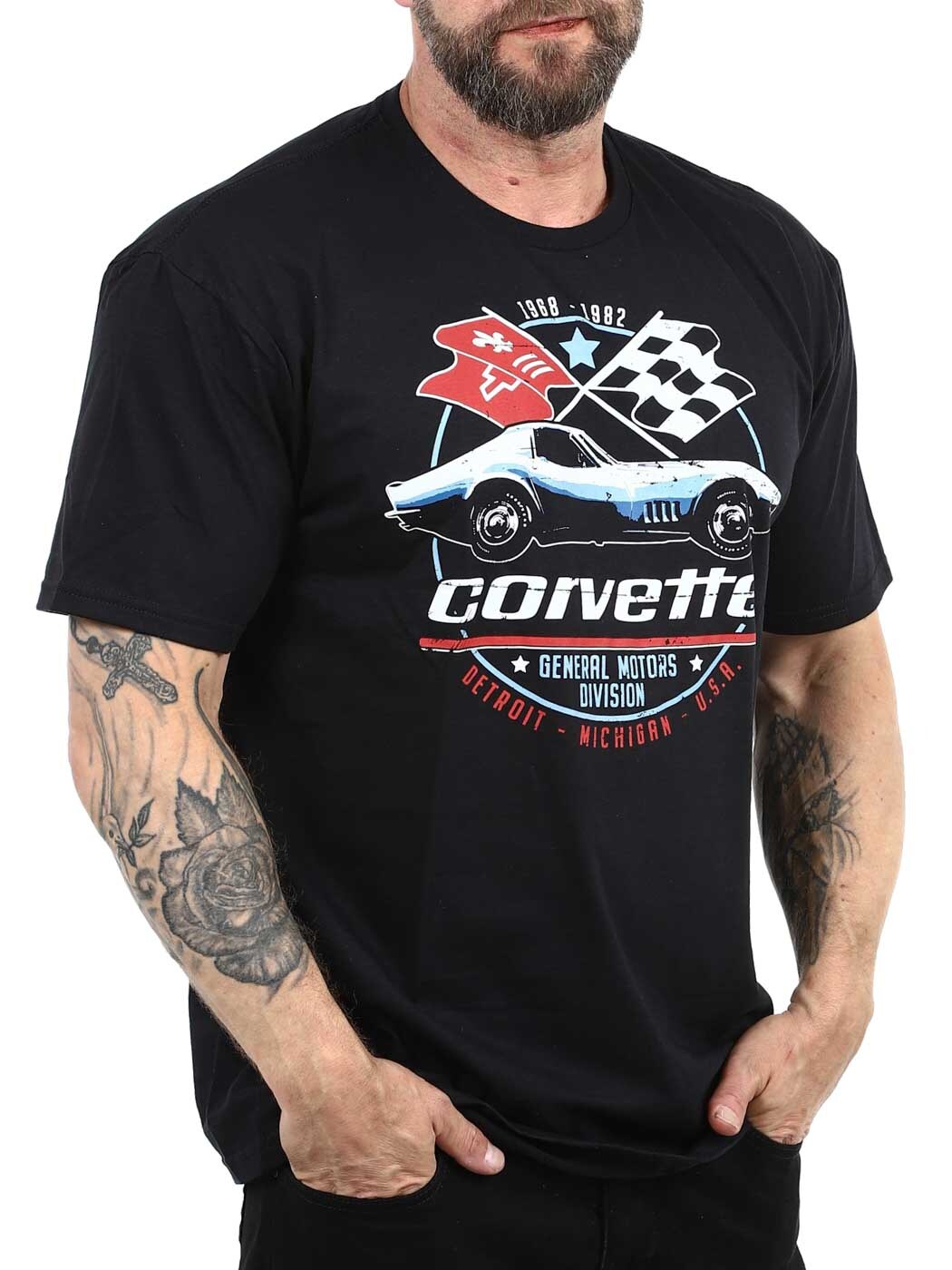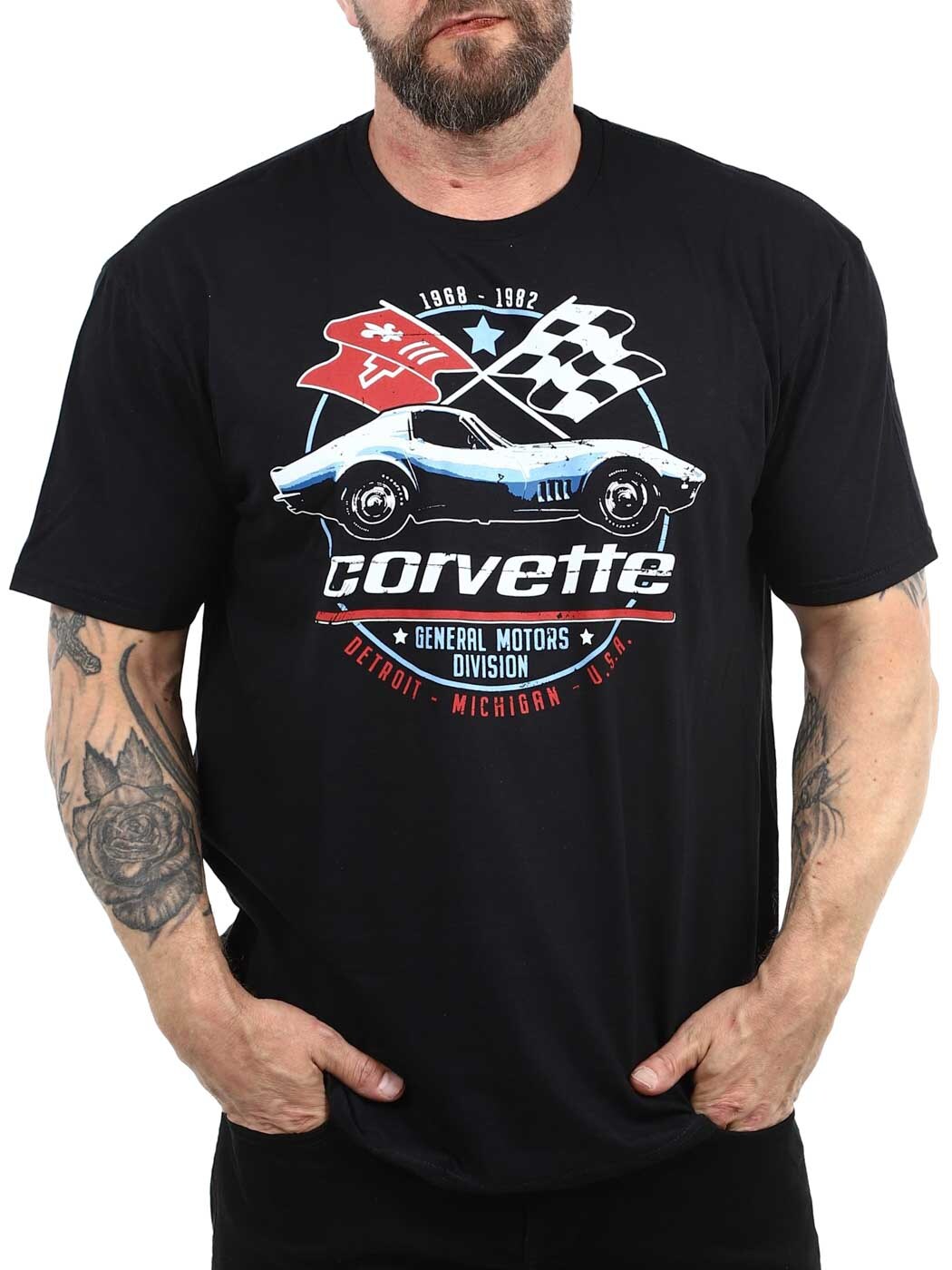 Czarna koszulka z kolorowym nadrukiem w stylu vintage przedstawiającym klasyczny model Corvette z lat 1968–1982. Niezbędny element garderoby dla miłośników motoryzacji, którzy chcą stylowo pokazać swoją pasję!