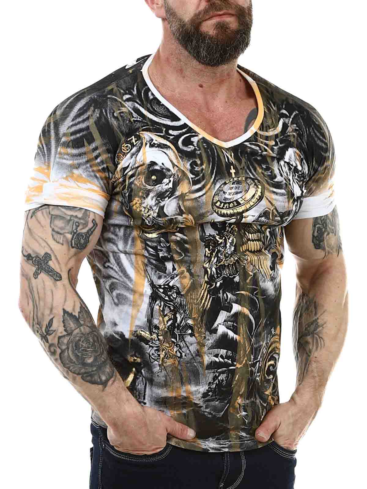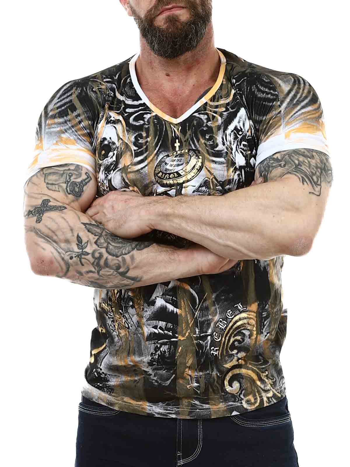 Koszulka z białą bazą i nadrukiem zarówno z przodu, jak i z tyłu w kontrastowym kolorze. Dopasowany model z elastycznej i wygodnej bawełny z dekoltem w serek.