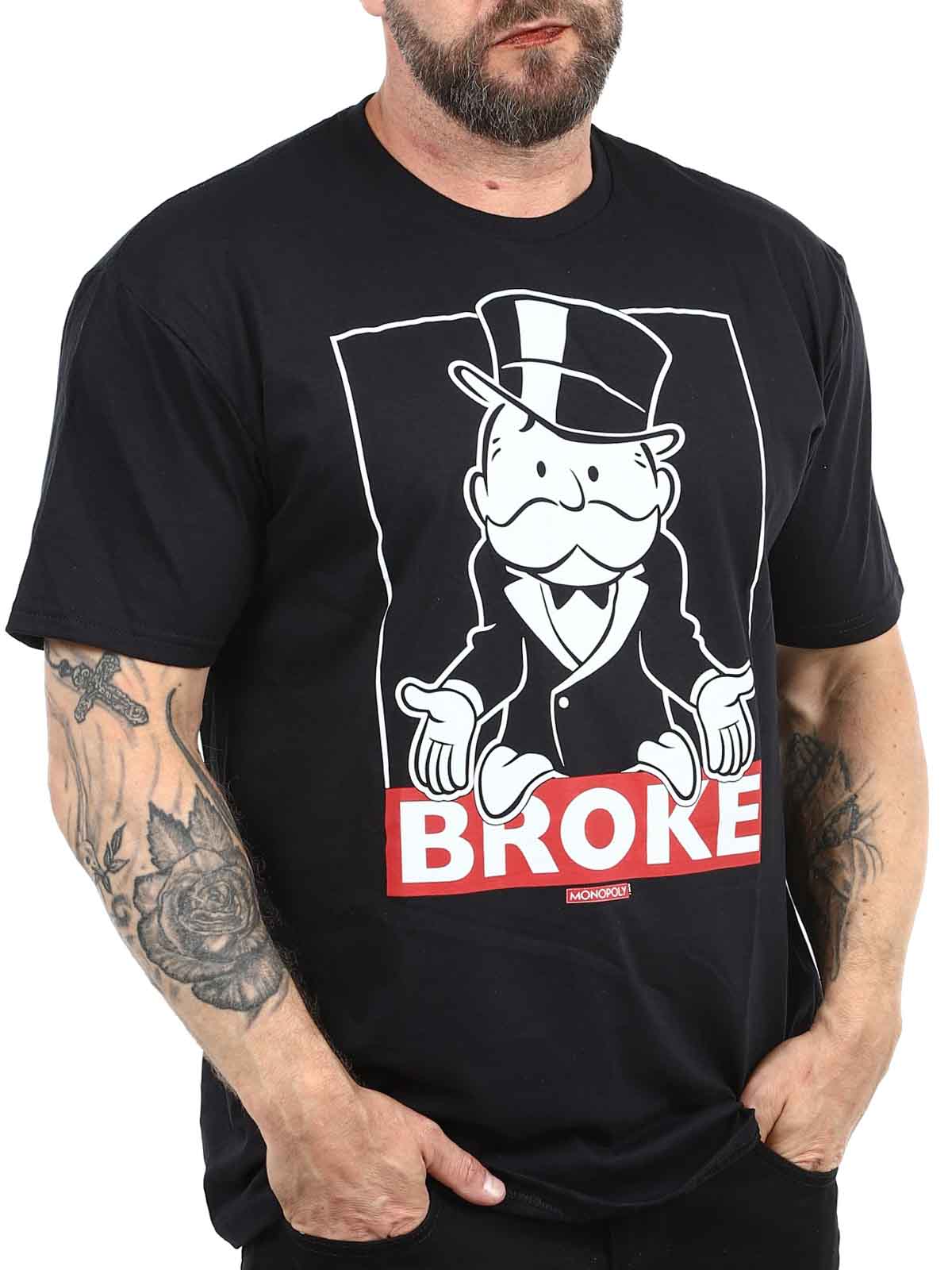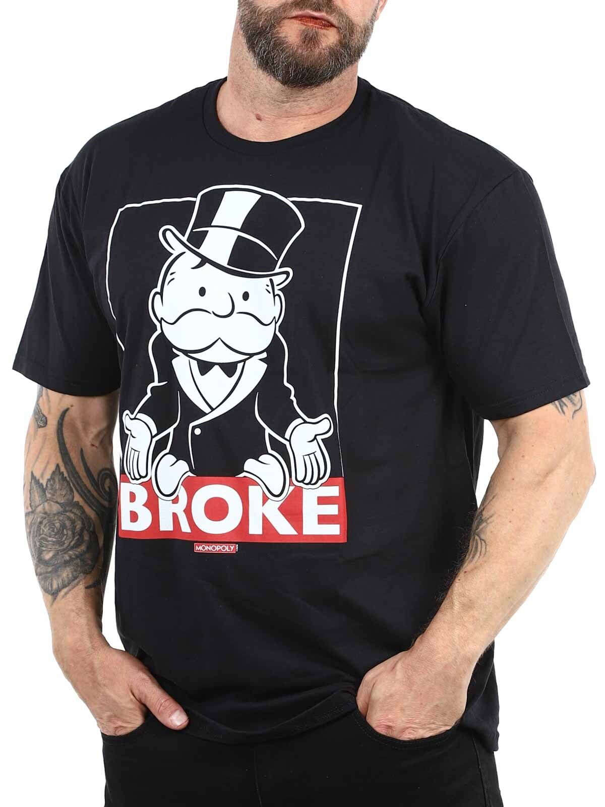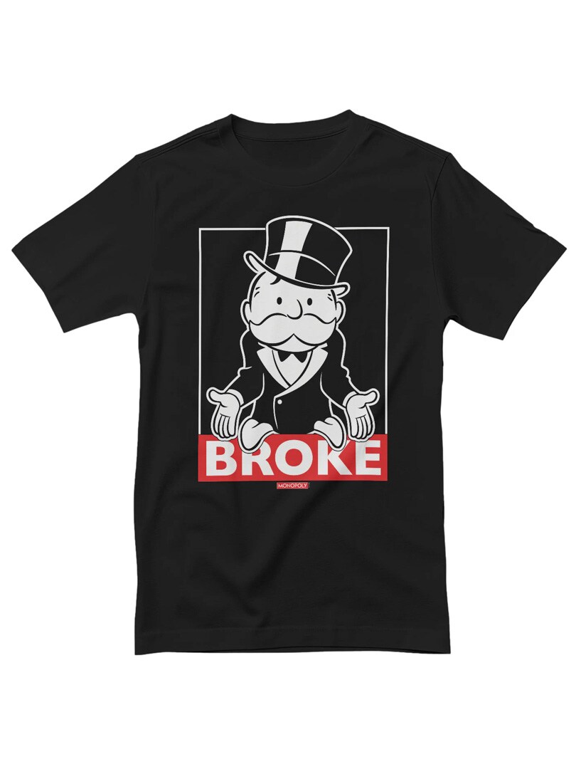 Czarna koszulka z motywem pana Monopoly w jego klasycznej pozie „bankrut”. Napis „BROKE” nadaje jej elegancki i autoironiczny charakter. Idealna dla fanów gier planszowych i osób z wyczuciem sarkazmu.