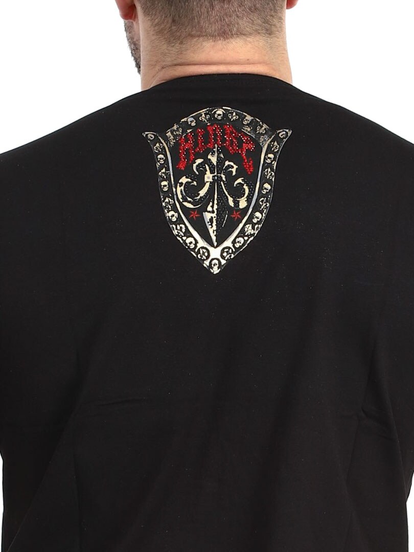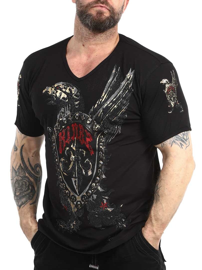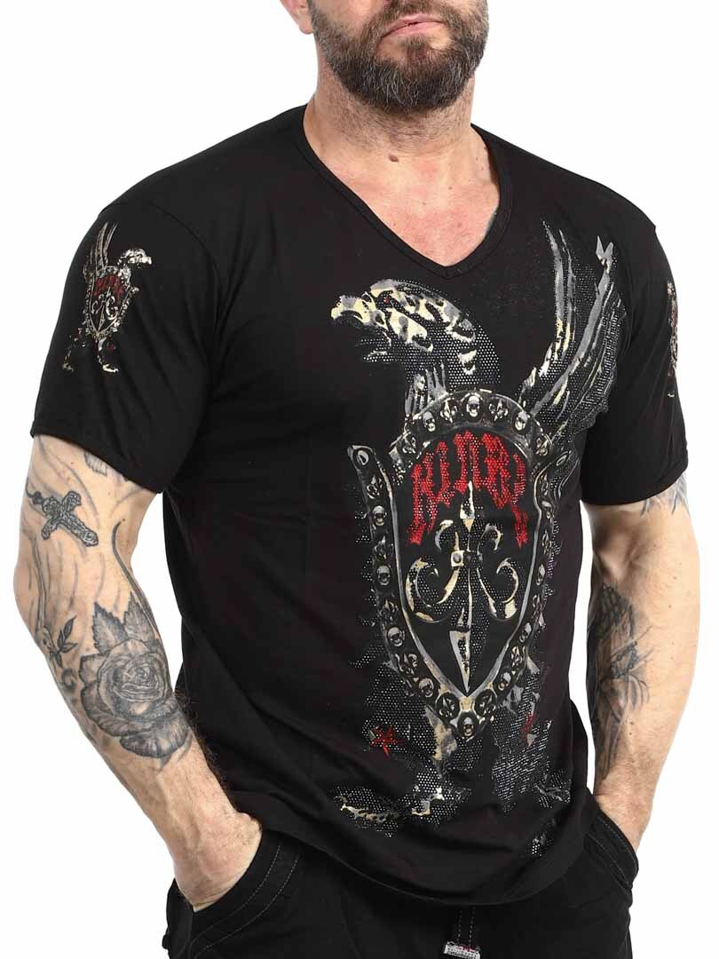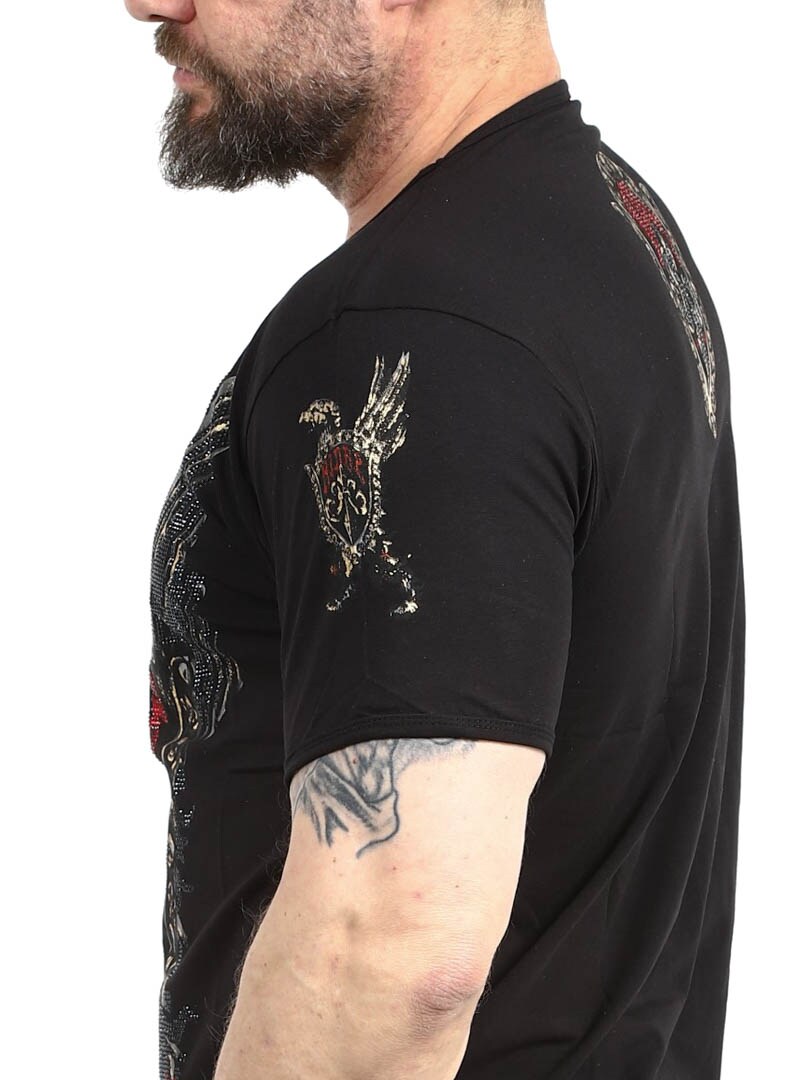T-shirt z dekoltem w kształcie litery V, ze stylowym nadrukiem i ozdobnymi kamieniami. Wykonany z wygodnej mieszanki bawełny, o dopasowanym kroju. Ta wyjątkowa koszulka jest przeznaczona dla tych, którzy chcą wyróżnić się z tłumu!