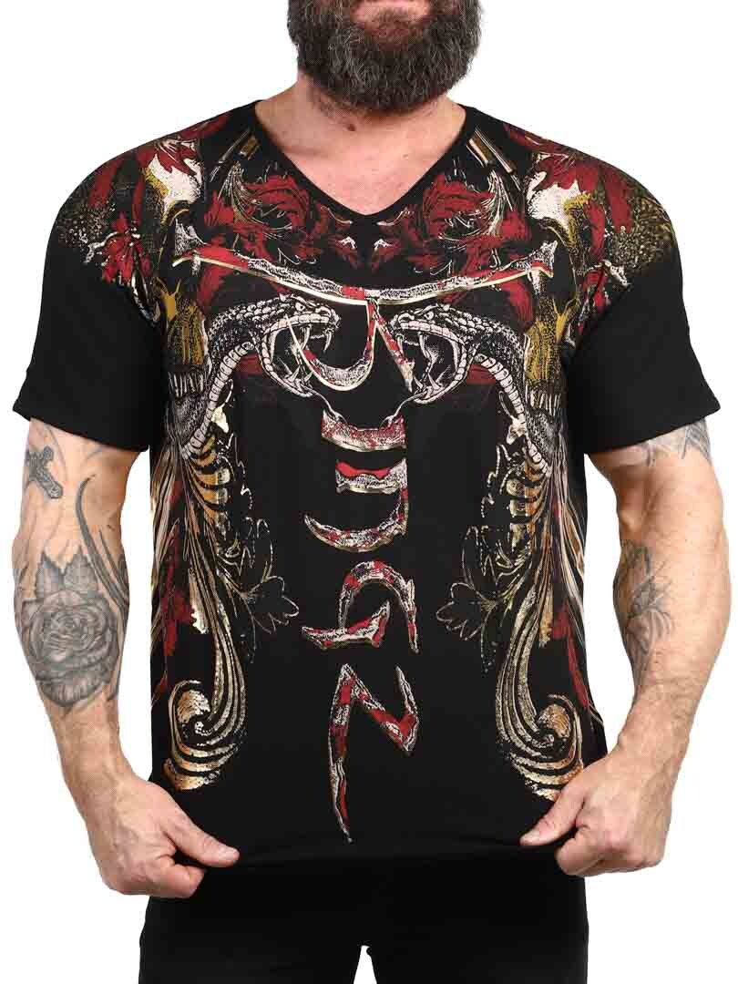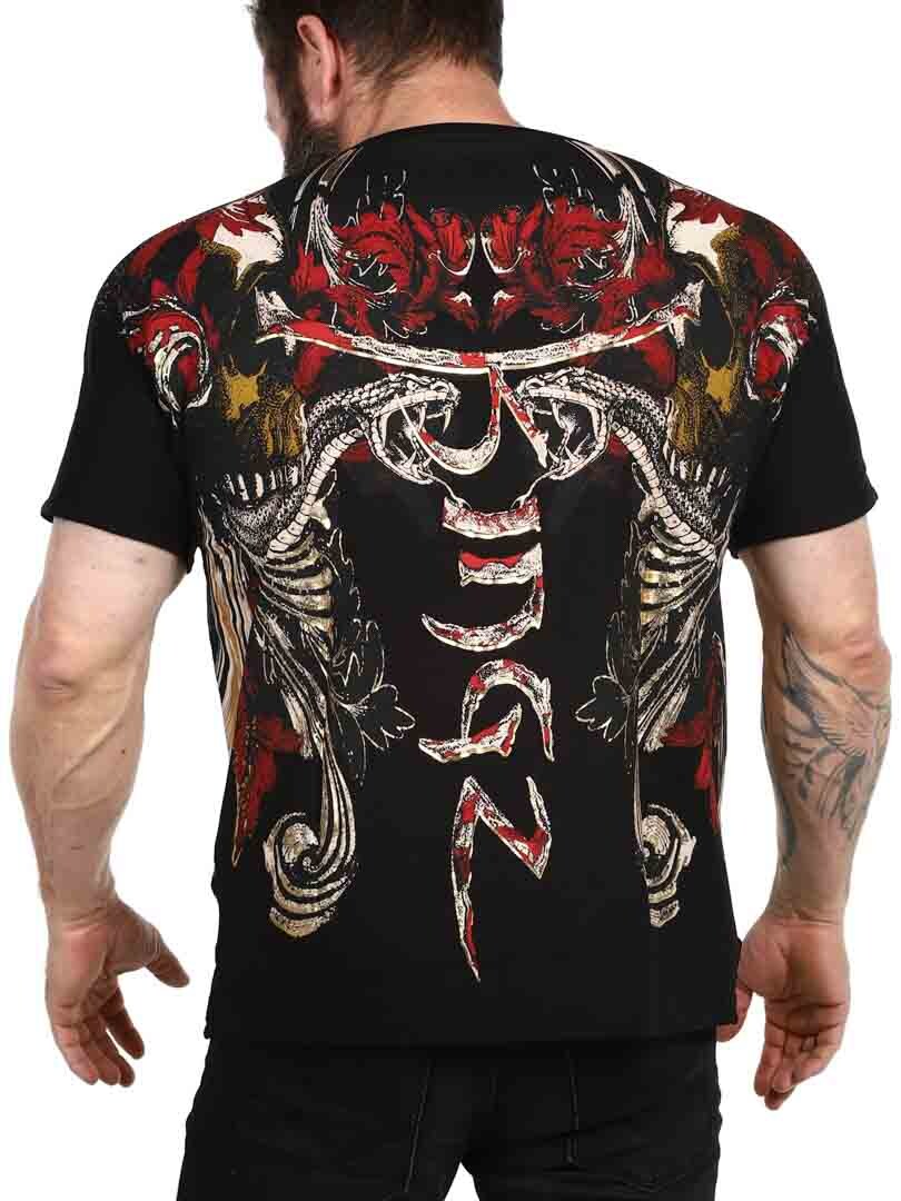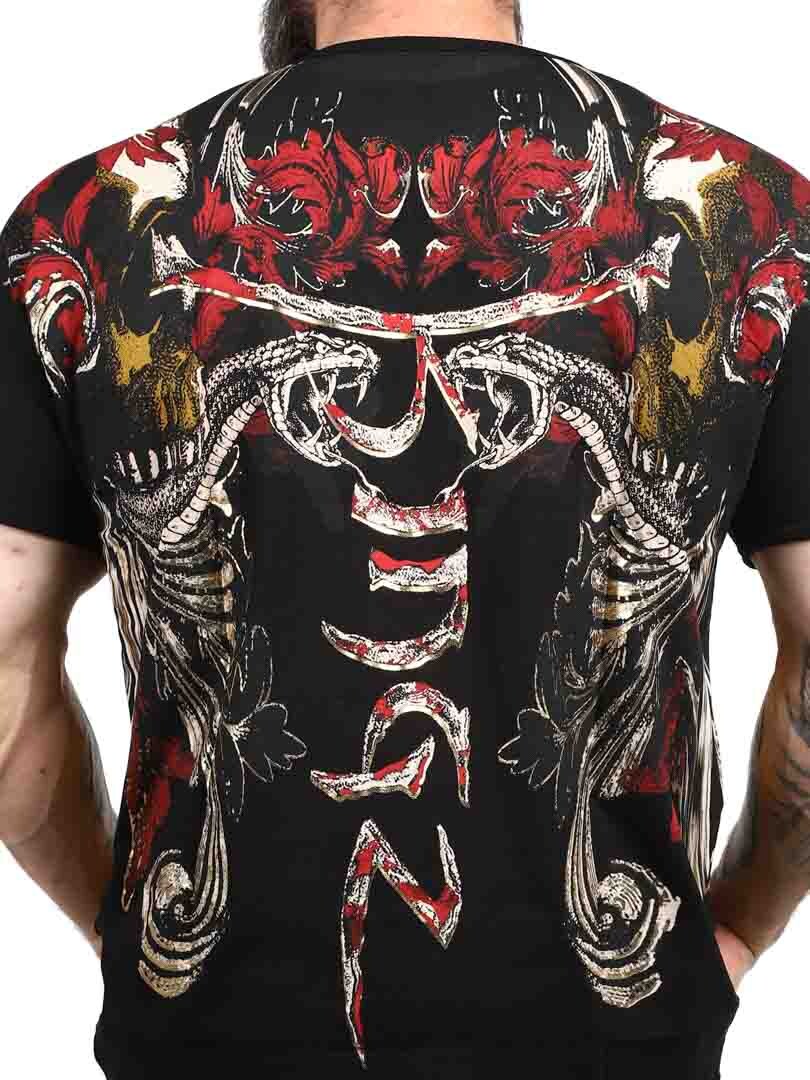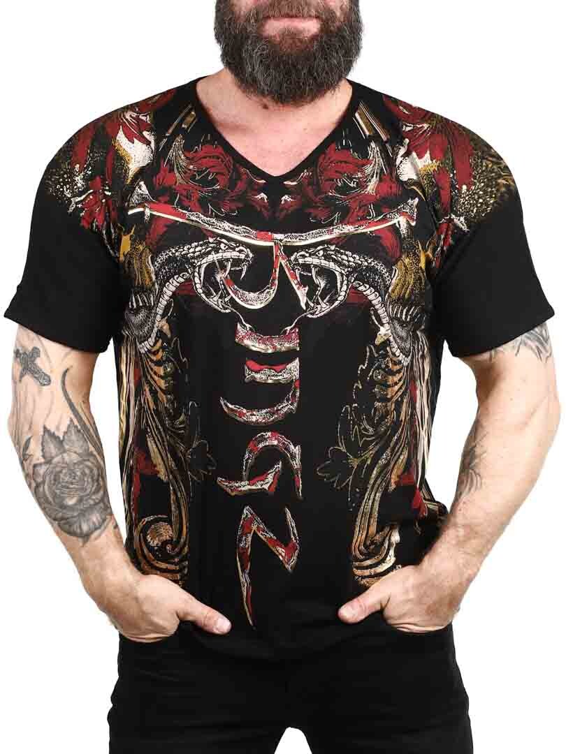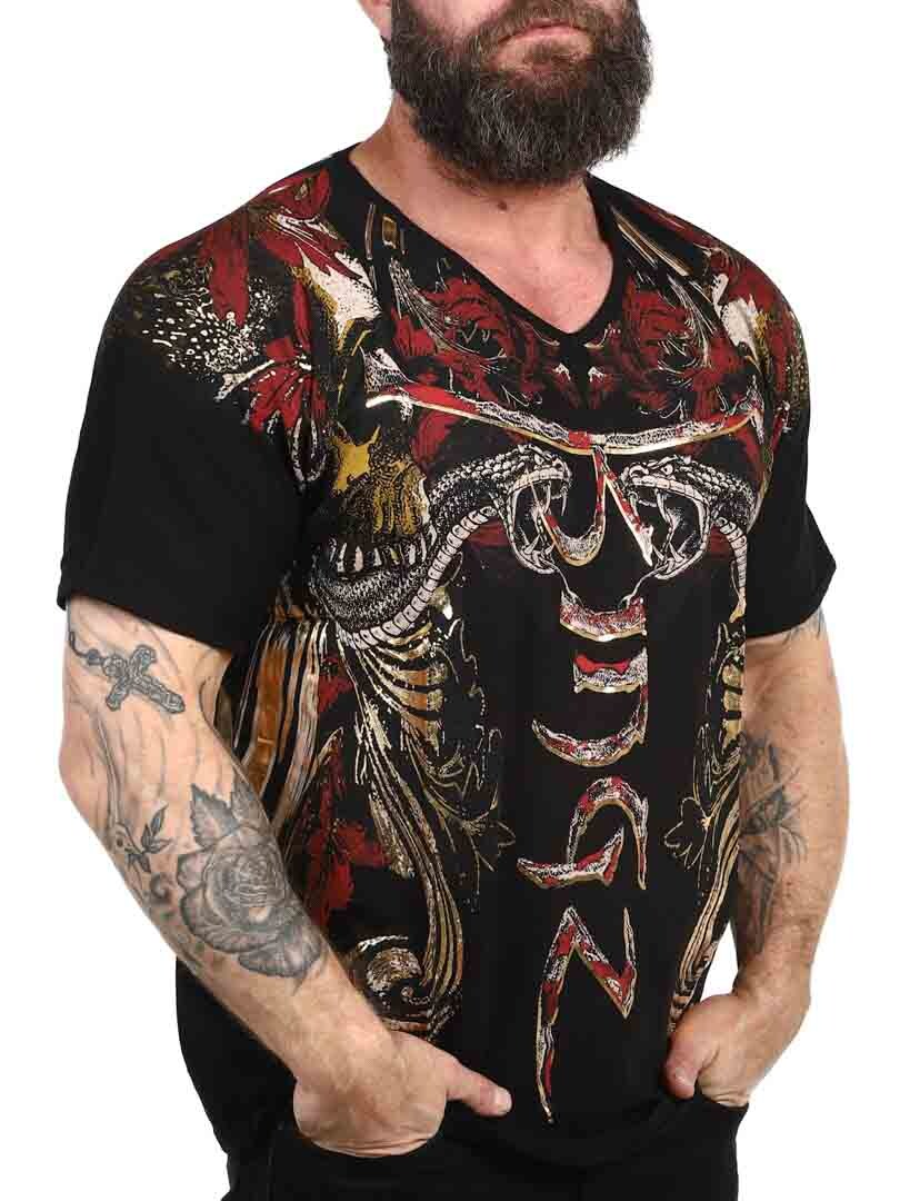 T-shirt o odważnym i wyrazistym designie, idealny dla tych, którzy chcą zrobić mocne wrażenie. Dzięki szczegółowemu nadrukowi, który łączy czaszki, węże i dynamiczne wzory w kolorze czerwonym, złotym i czarnym, koszulka nadaje buntowniczy i artystyczny charakter. Wykonana z elastycznej bawełny z dekoltem w szpic. Oczywisty wybór dla tych, którzy chcą wyjątkowego wyglądu z nastawieniem!