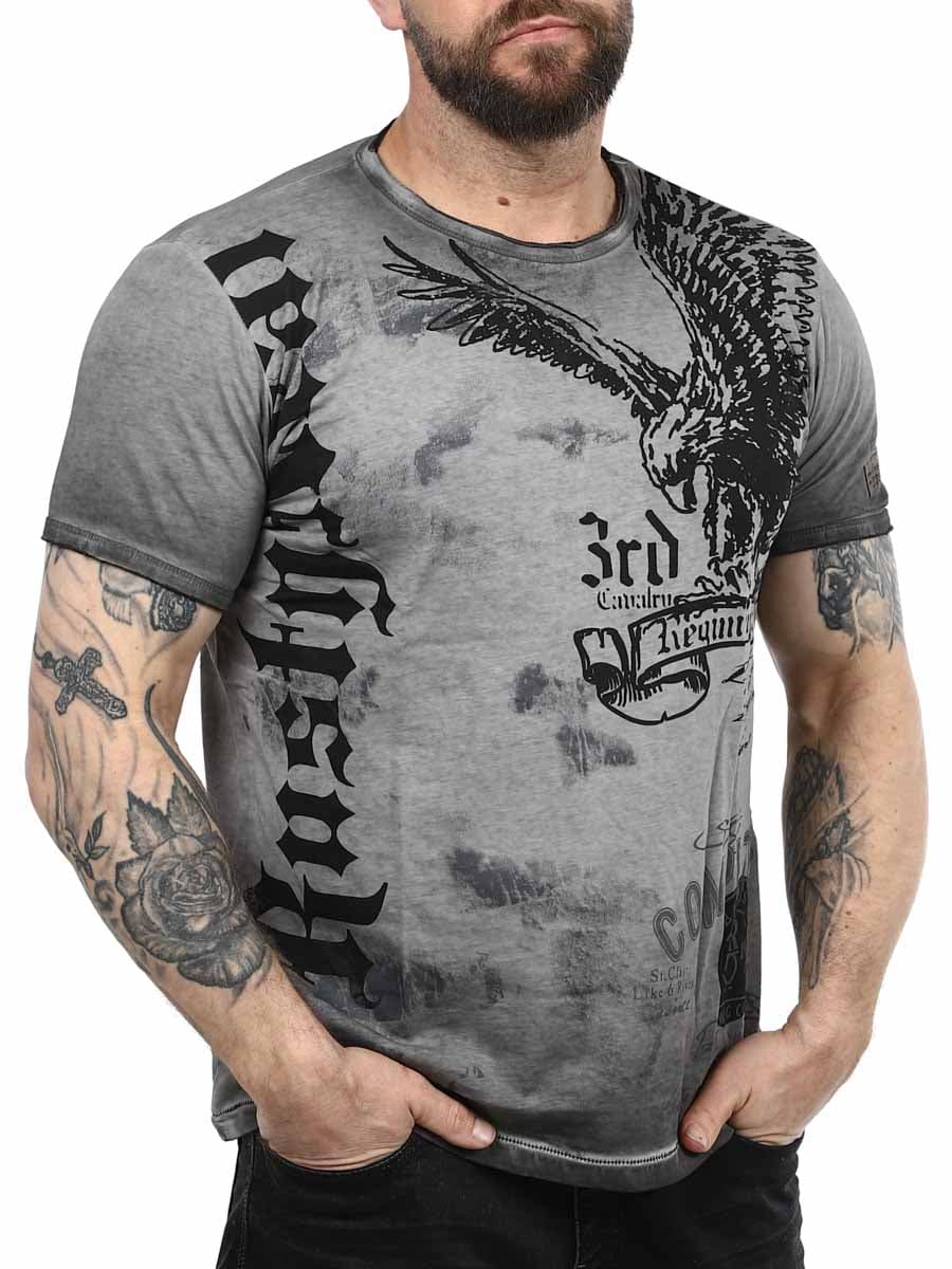 Ciemnoszara koszulka z zaokrąglonym dekoltem i nadrukiem w kolorze czarnym i szarym z przodu. Ma surowe krawędzie przy rękawach i szyi oraz naszywkę z materiału w kolorze beżowym z logo na lewym rękawie. 100% bawełny i duża rozciągliwość sprawiają, że wygodnie leży na ciele.
