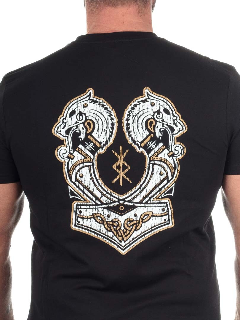 RockDenim RD Frontier T-shirt w czarnej bawełnie ma surowy, inspirowany wikingami nadruk, który łączy historię z rockowym stylem.