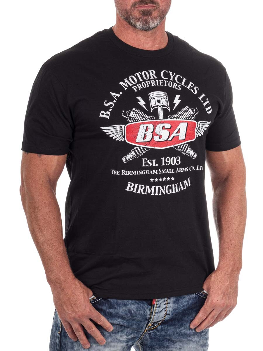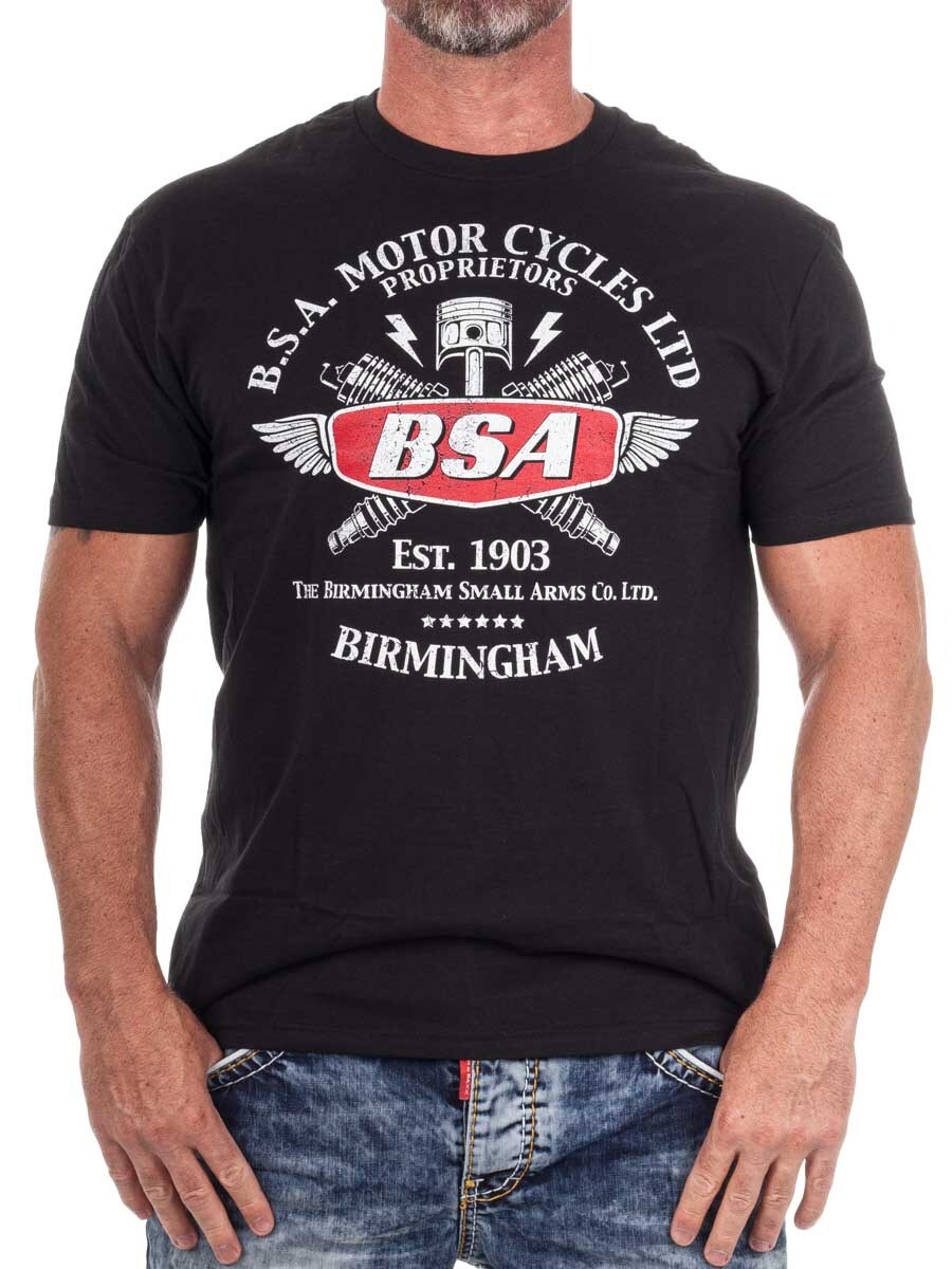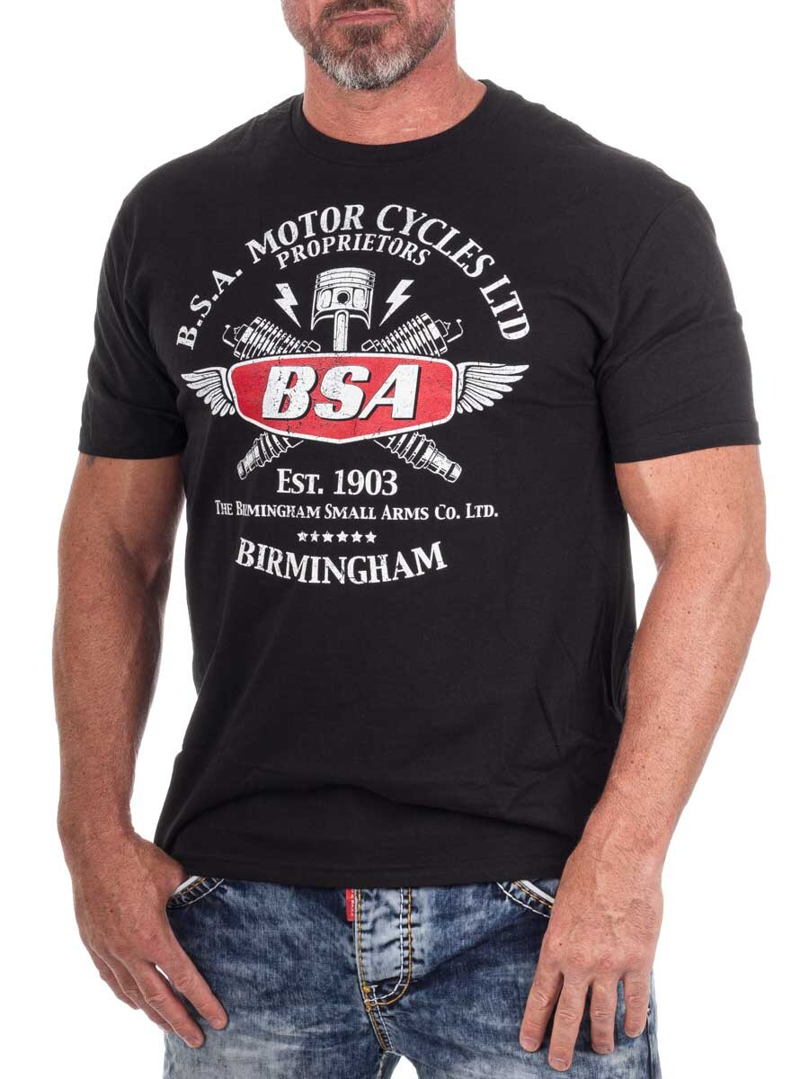 Koszulka z klasycznym nadrukiem motocyklowym od B.S.A. Motor Cycles Ltd, inspirowana legendarną brytyjską marką Birmingham Small Arms Company. Wykonana z miękkiej bawełny, zapewniającej wysoki komfort i trwałość. Klasyczny krój i okrągły dekolt.