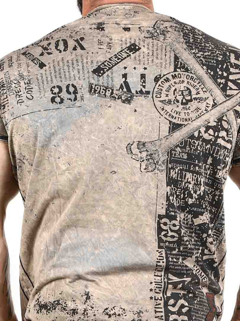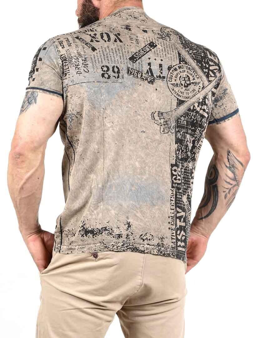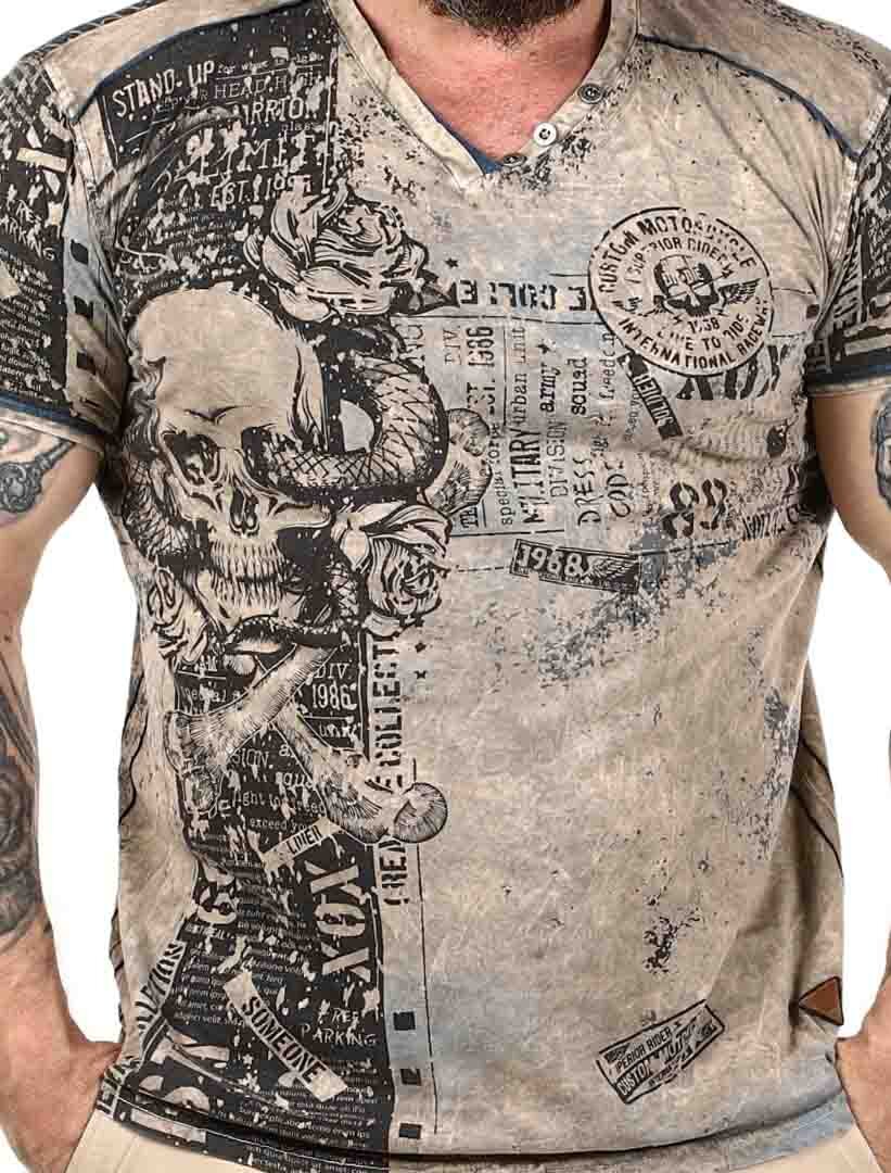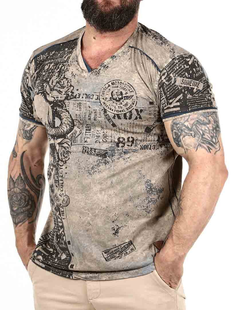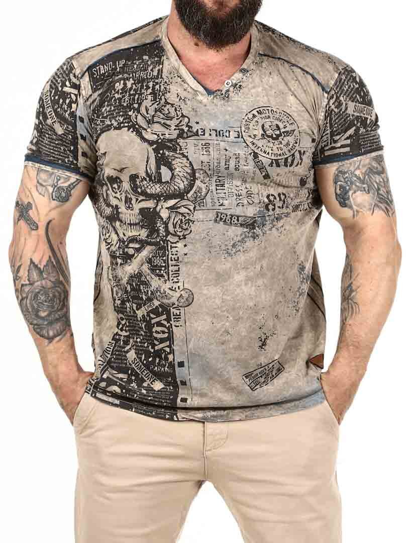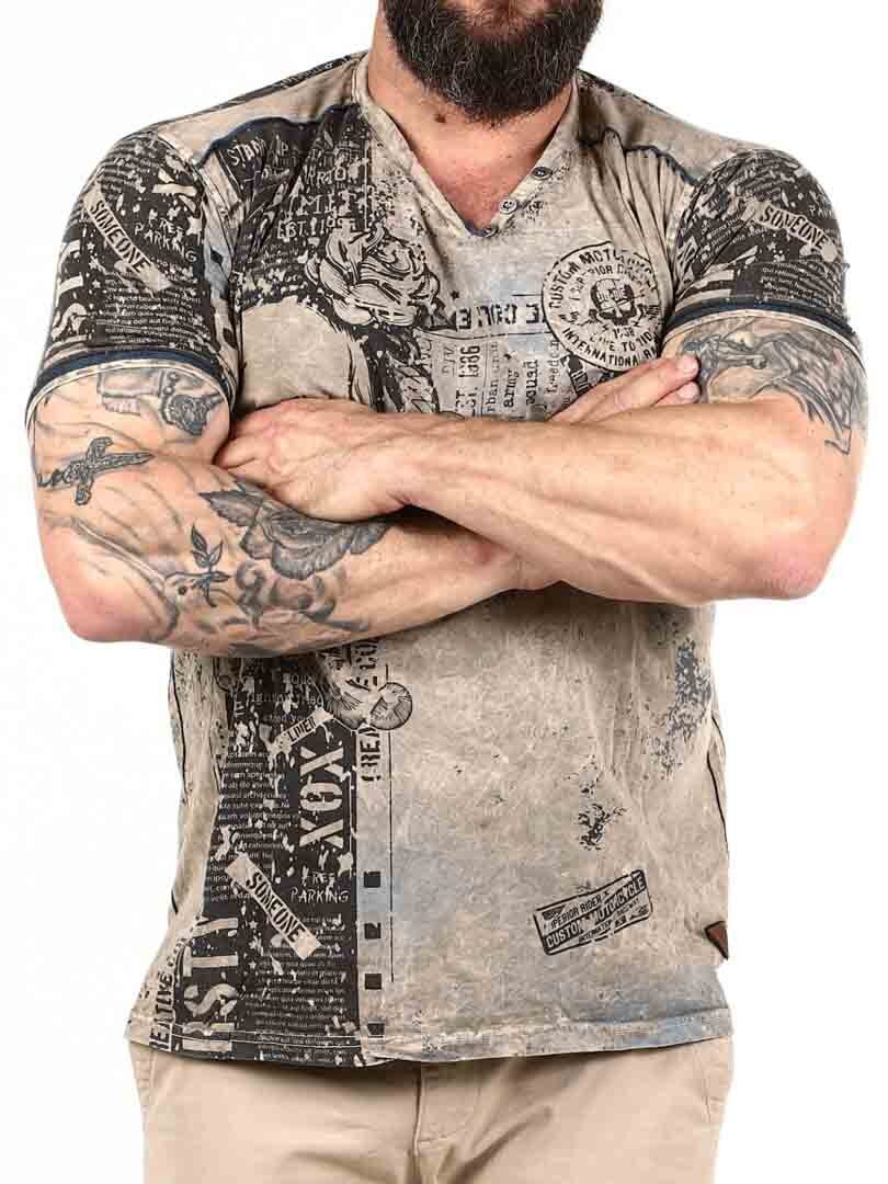 T-shirt z dekoltem w kształcie litery V i stylowymi nadrukami. Ozdobne guziki przy dekolcie i naszywki z logo u dołu. Wykonany z miękkiej i rozciągliwej bawełny.