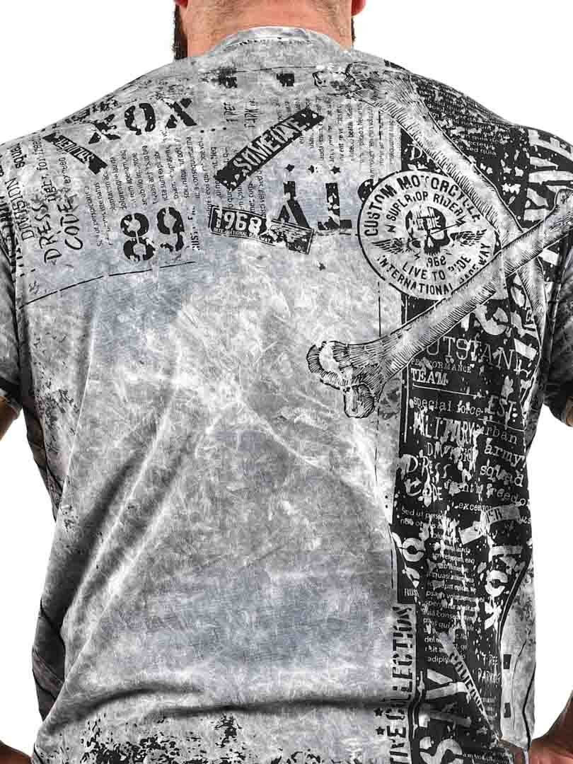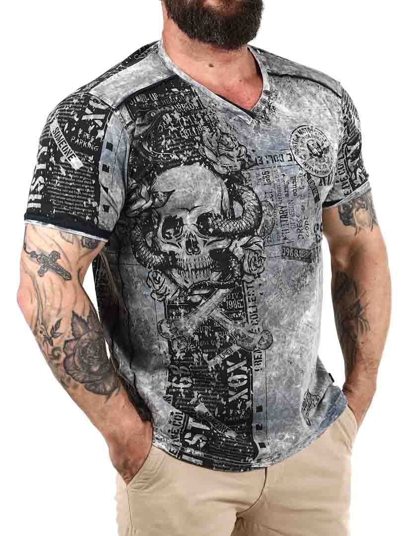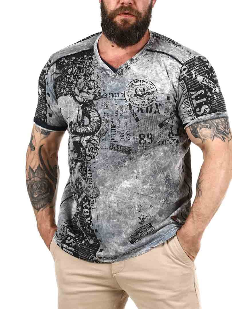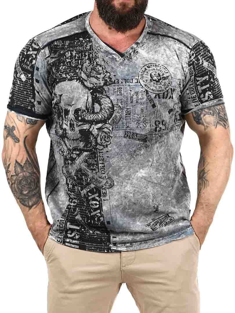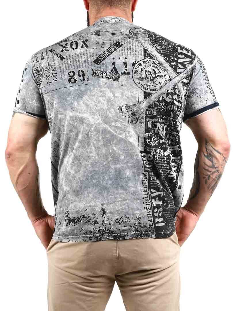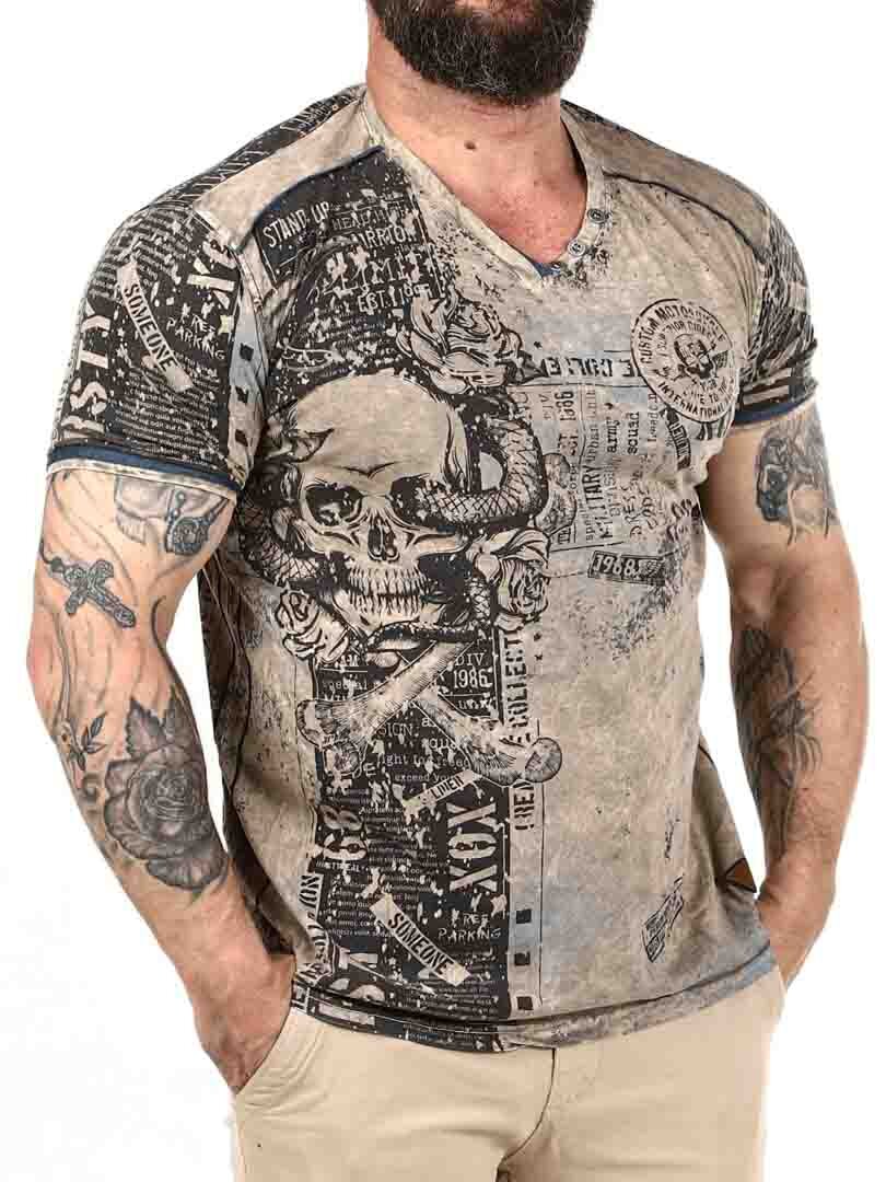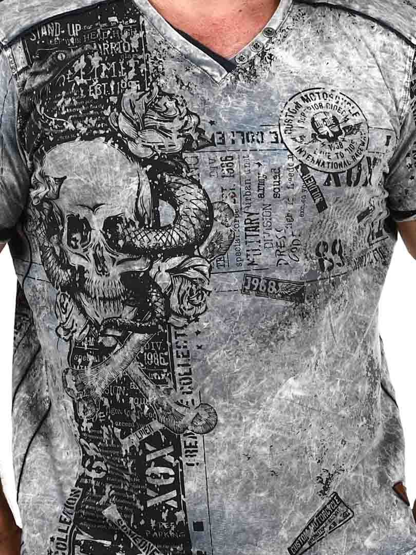 T-shirt z dekoltem w kształcie litery V i stylowymi nadrukami. Ozdobne guziki przy dekolcie i naszywki z logo u dołu. Wykonany z miękkiej i rozciągliwej bawełny.