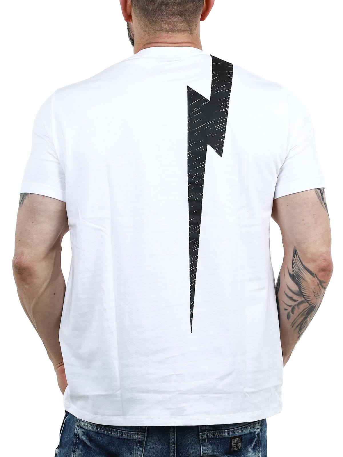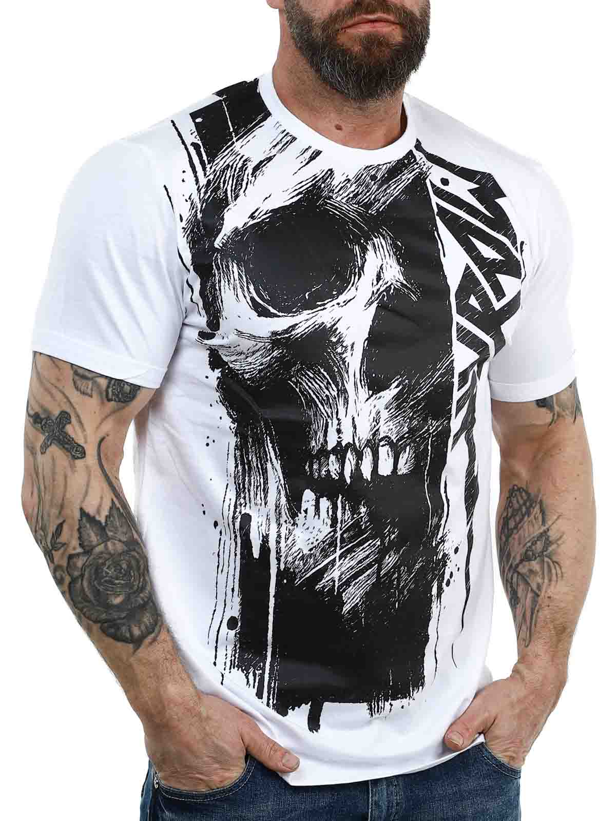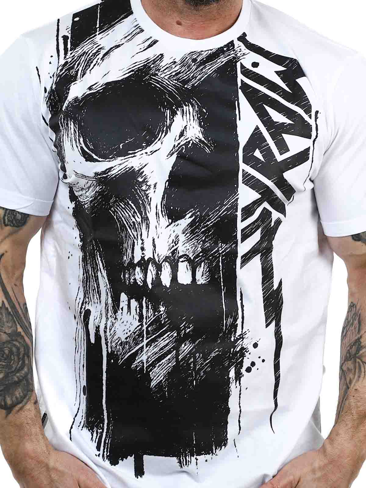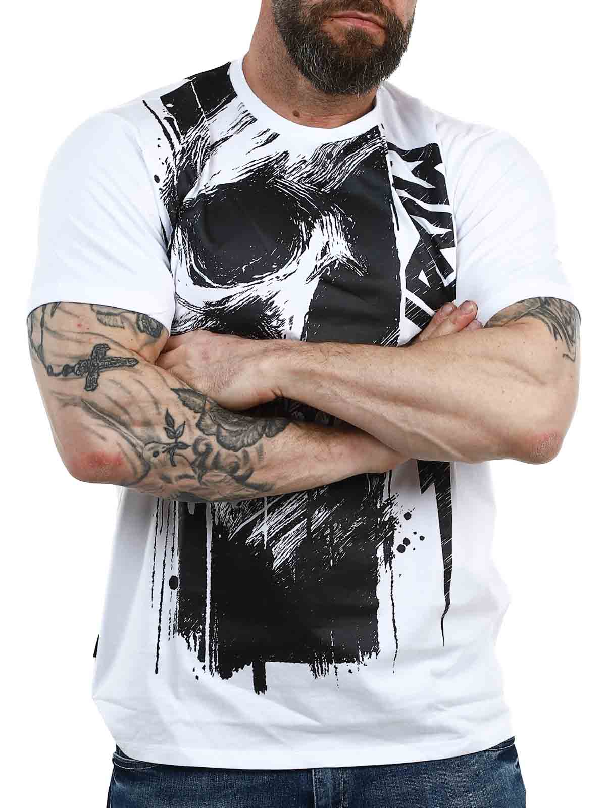 Podnieś swój codzienny styl dzięki tej białej koszulce, która łączy czystą, ponadczasową bazę z mocnym czarnym nadrukiem. Posiada duży motyw, który pokrywa przód i płynnie przechodzi na plecy, tworząc spójny i nowoczesny wygląd. Wykonana w 100% z miękkiej bawełny, klasyczny krój.