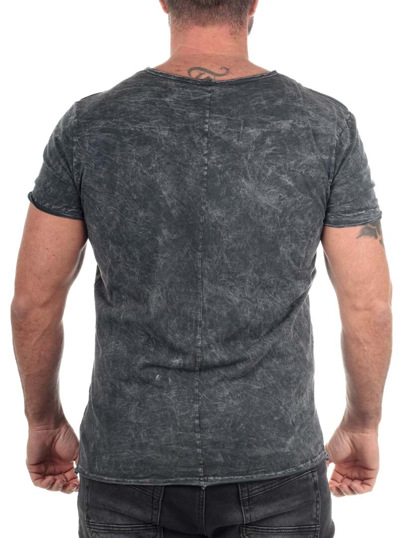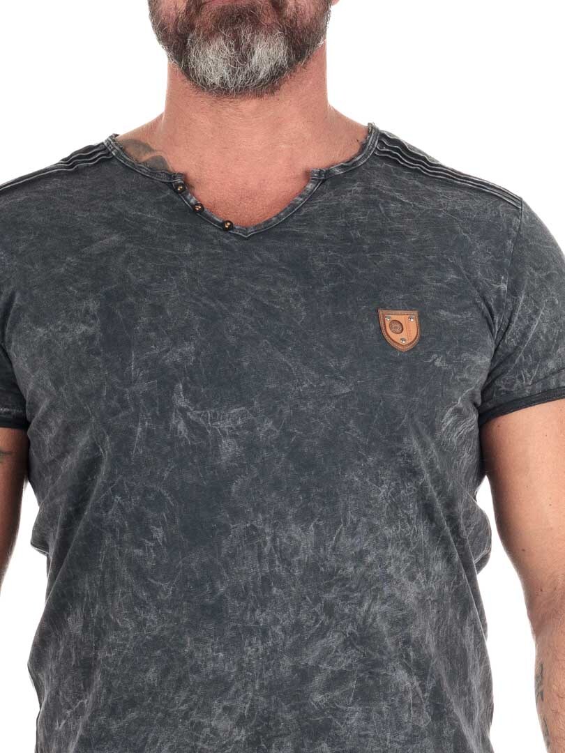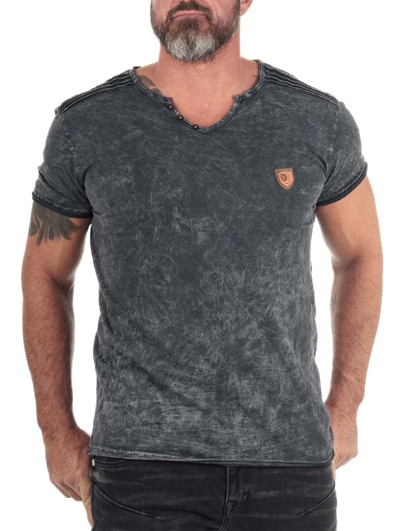 Wykonany z wygodnego i elastycznego materiału bawełnianego, z guzikami przy dekolcie. Wzór posiada surowo wykończone krawędzie oraz grube szwy, które stylowo podkreślają linie ramion. Na lewej piersi znajduje się naszywka z imitacji skóry z logo.