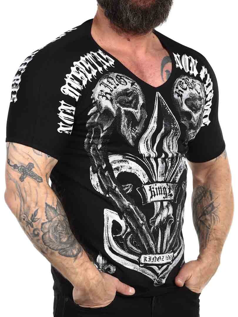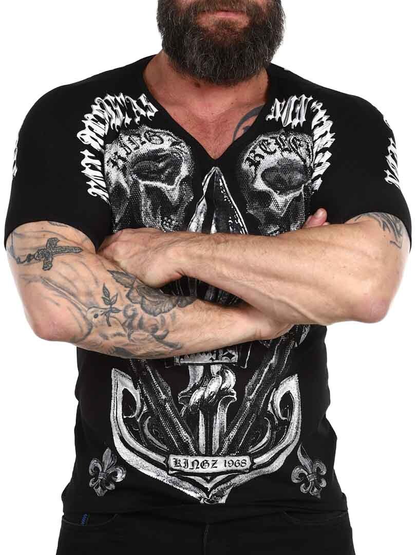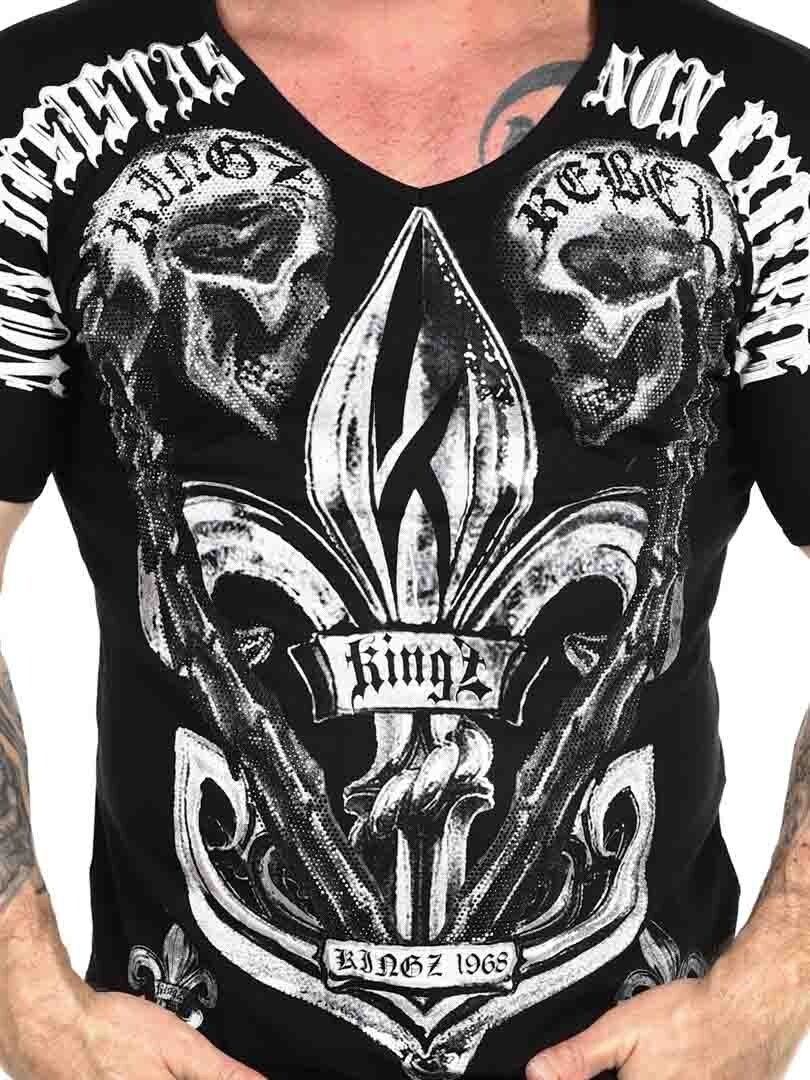 T-shirt z dekoltem w kształcie litery V, ze stylowym nadrukiem i ozdobnymi kamieniami. Wykonany z wygodnej mieszanki bawełny, o dopasowanym kroju. Ta wyjątkowa koszulka jest przeznaczona dla tych, którzy chcą wyróżnić się z tłumu!