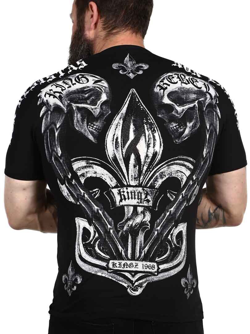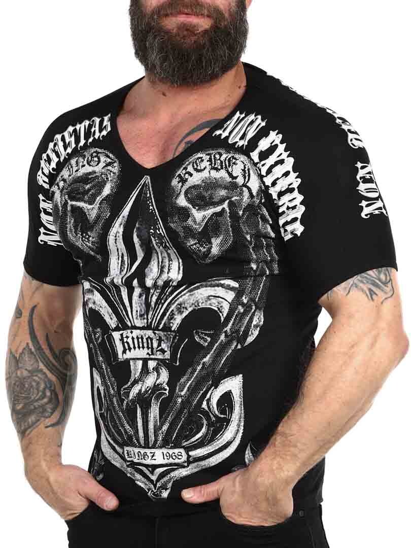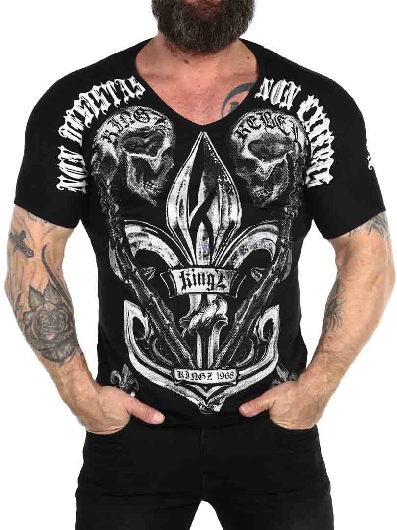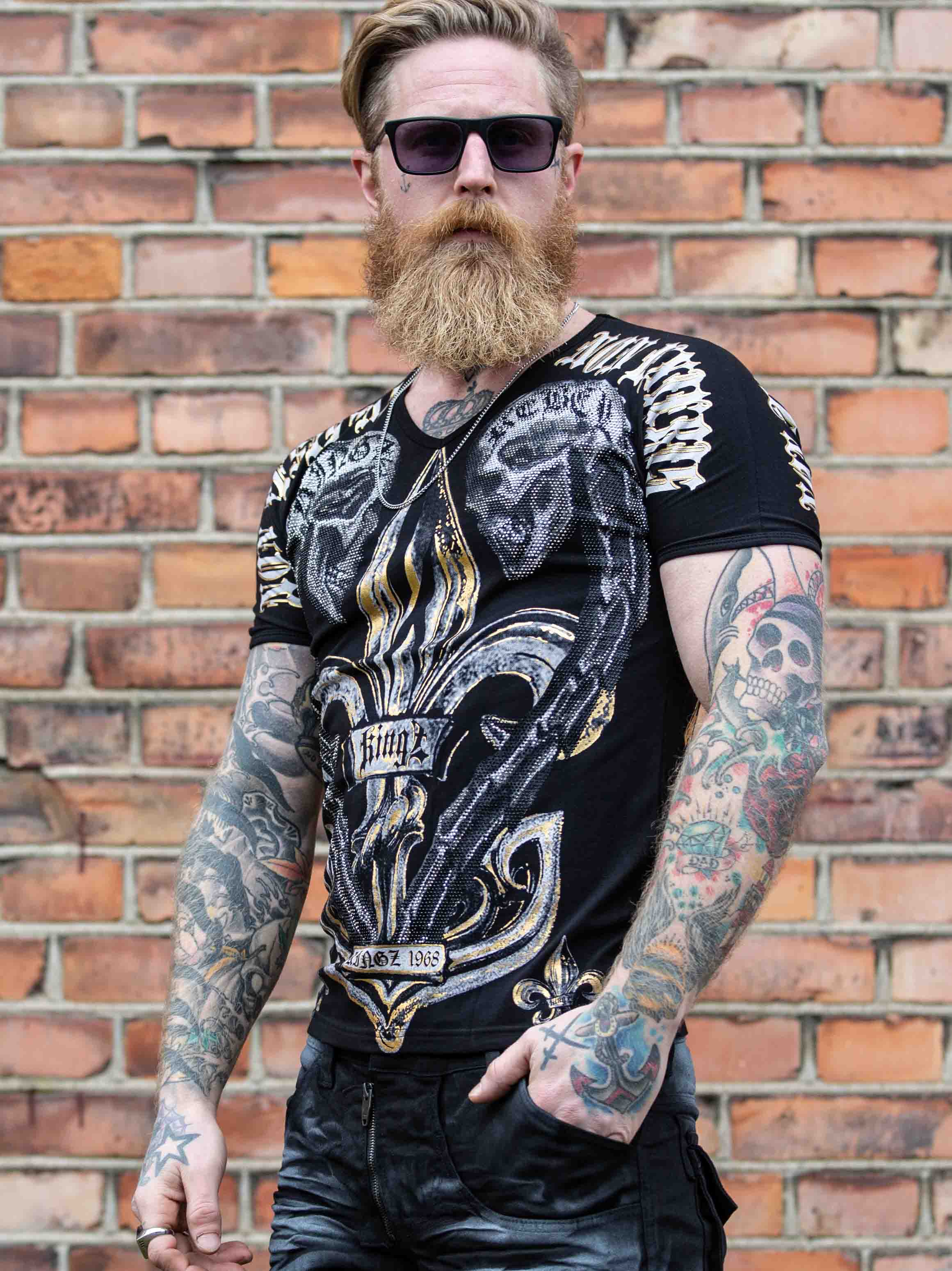 T-shirt z dekoltem w kształcie litery V, ze stylowym nadrukiem i ozdobnymi kamieniami. Wykonany z wygodnej mieszanki bawełny, o dopasowanym kroju. Ta wyjątkowa koszulka jest przeznaczona dla tych, którzy chcą wyróżnić się z tłumu!