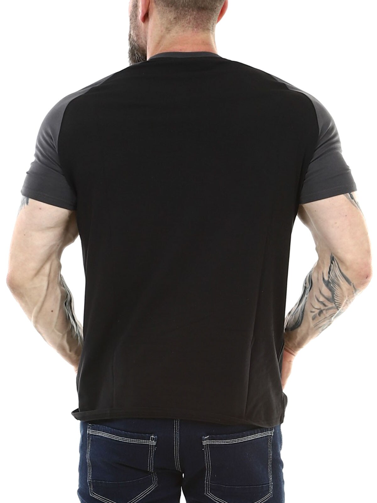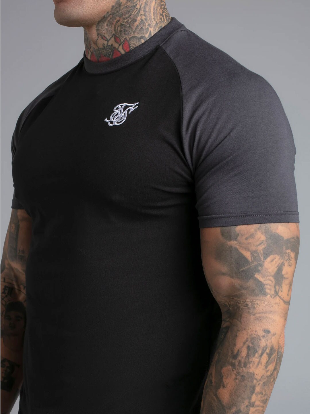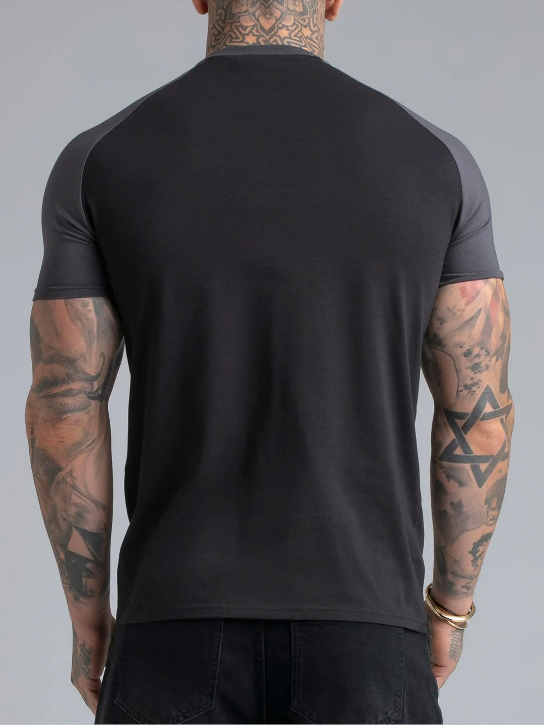 Stylowy czarny T-shirt z ciemnoszarymi rękawami oraz białym haftowanym logo na piersi. Idealny wybór dla osób, które chcą połączyć komfort, sportowy charakter i nowoczesny design. Koszulka wykonana jest z miękkiego i elastycznego materiału, który dopasowuje się do ruchów ciała, nie tracąc swojego kształtu.