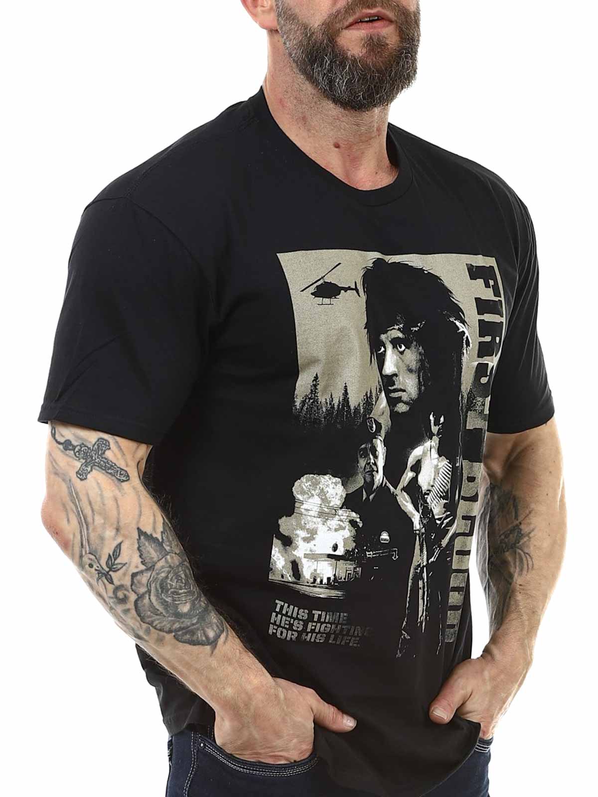 Uhonoruj jedną z najbardziej ikonicznych postaci filmów akcji dzięki tej koszulce inspirowanej First Blood, w której John Rambo walczy o przetrwanie i wolność w twardej i niezapomnianej historii akcji z lat 80. Nadruk nadaje koszulce surowy, nostalgiczny charakter i jest idealny dla fanów klasyków akcji i filmów kultowych. Koszulka ma klasyczny krój i okrągły dekolt.