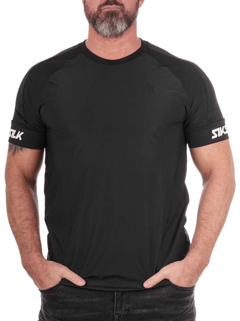 Poznaj T-shirt, który sprawdzi się zarówno na siłowni, jak i na co dzień. Czarny kolor w połączeniu z kultowym logo na zakończeniach rękawów nadaje koszulce nowoczesny i sportowy wygląd. Wykonana z lekkiego, elastycznego i szybkoschnącego materiału zapewnia optymalną swobodę ruchu i wentylację. Krój jest atletyczny — dopasowany, lecz nie obcisły.